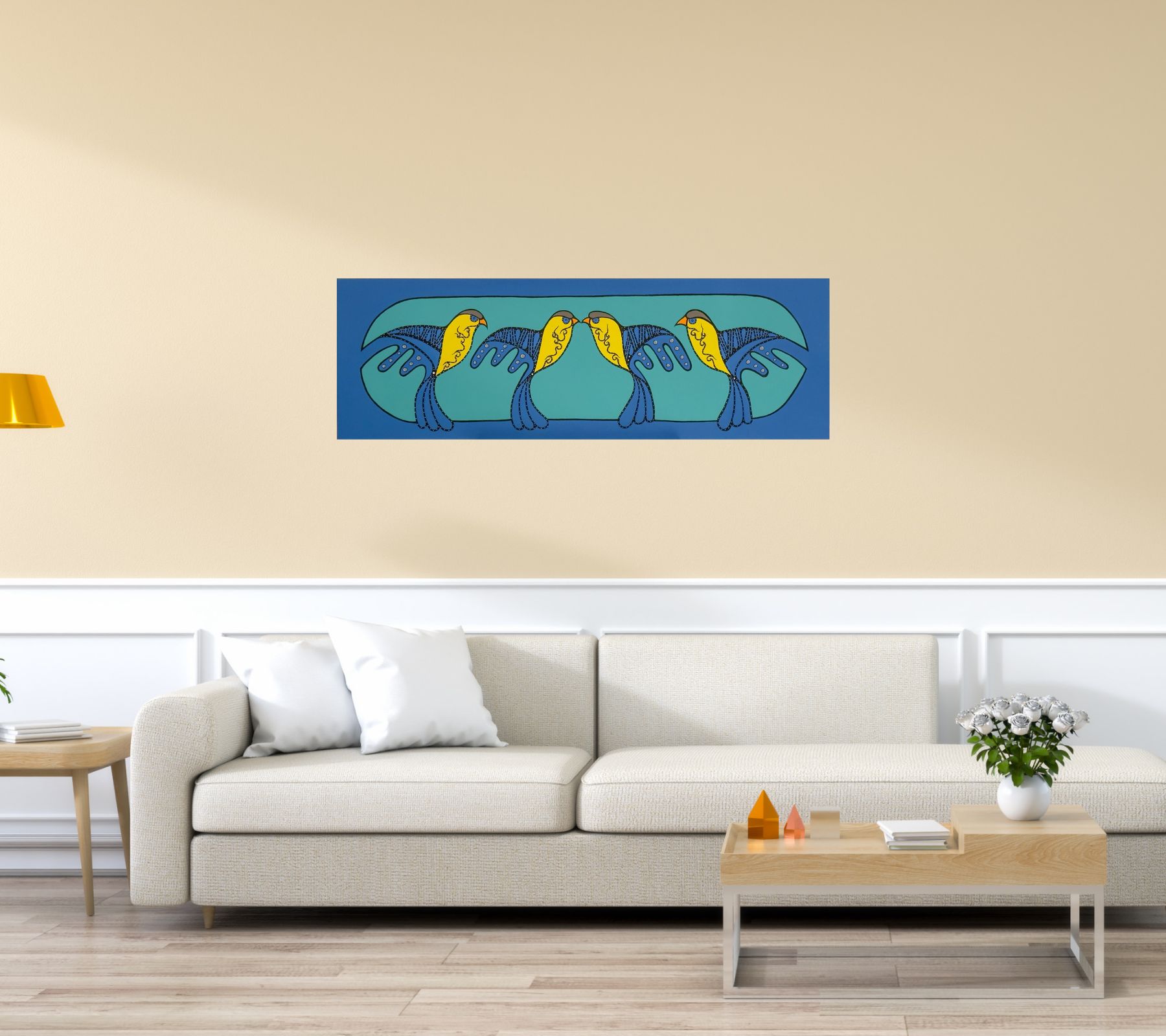 Aginjibagwesi Four Birds presents a rhythmic and harmonious composition of four birds arranged in mirrored pairs, forming a continuous visual flow across the surface. Their interconnected forms suggest communication, companionship, and the quiet balance found within community.