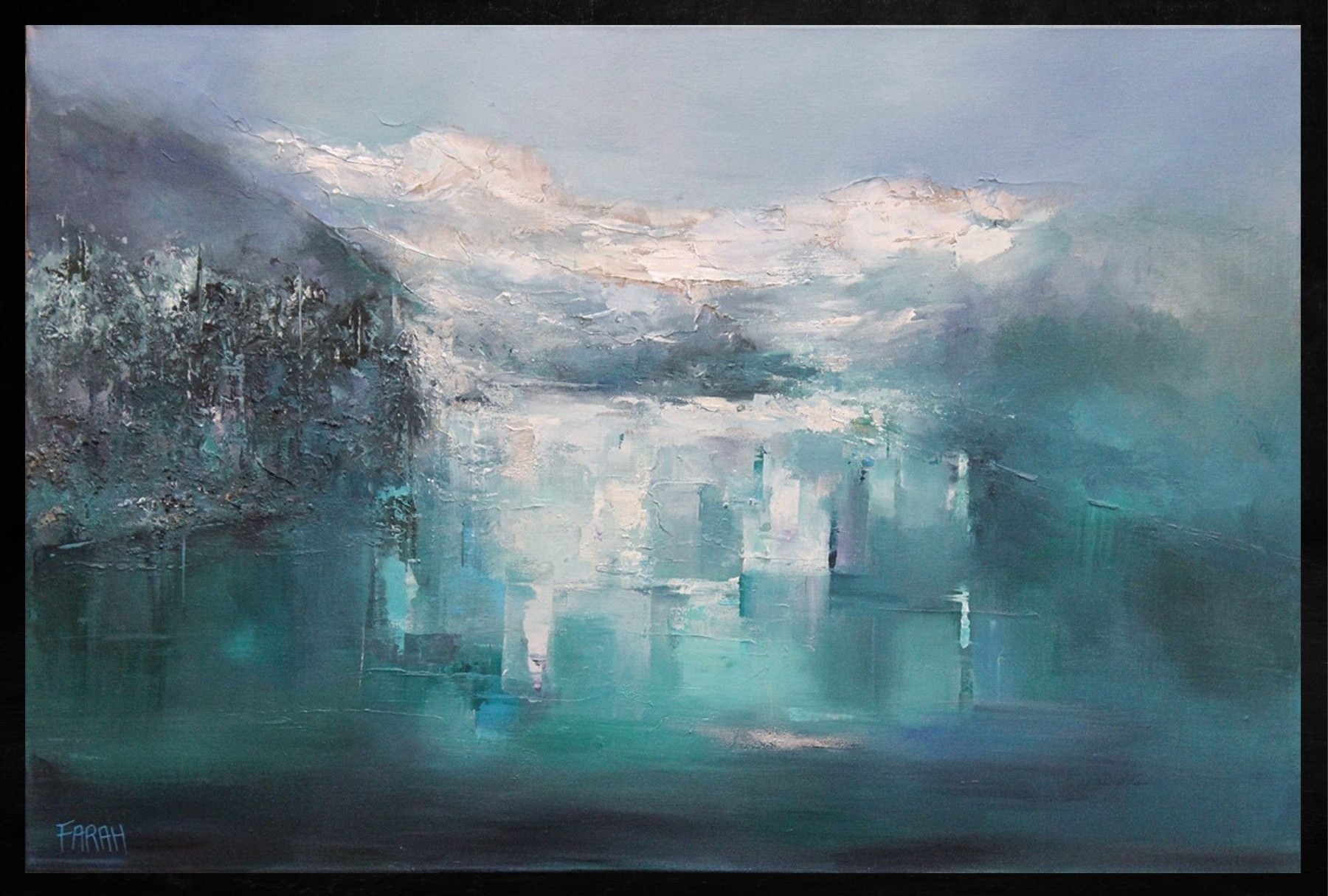 Farahnaz Samari approaches Lake Louise not as a literal view, but as an emotional presence. Through layered textures and diffused color transitions, she allows the mountains to dissolve gently into light while the water becomes a luminous field of reflection. Forms emerge and recede, creating a sense of silence, depth, and boundless calm.
