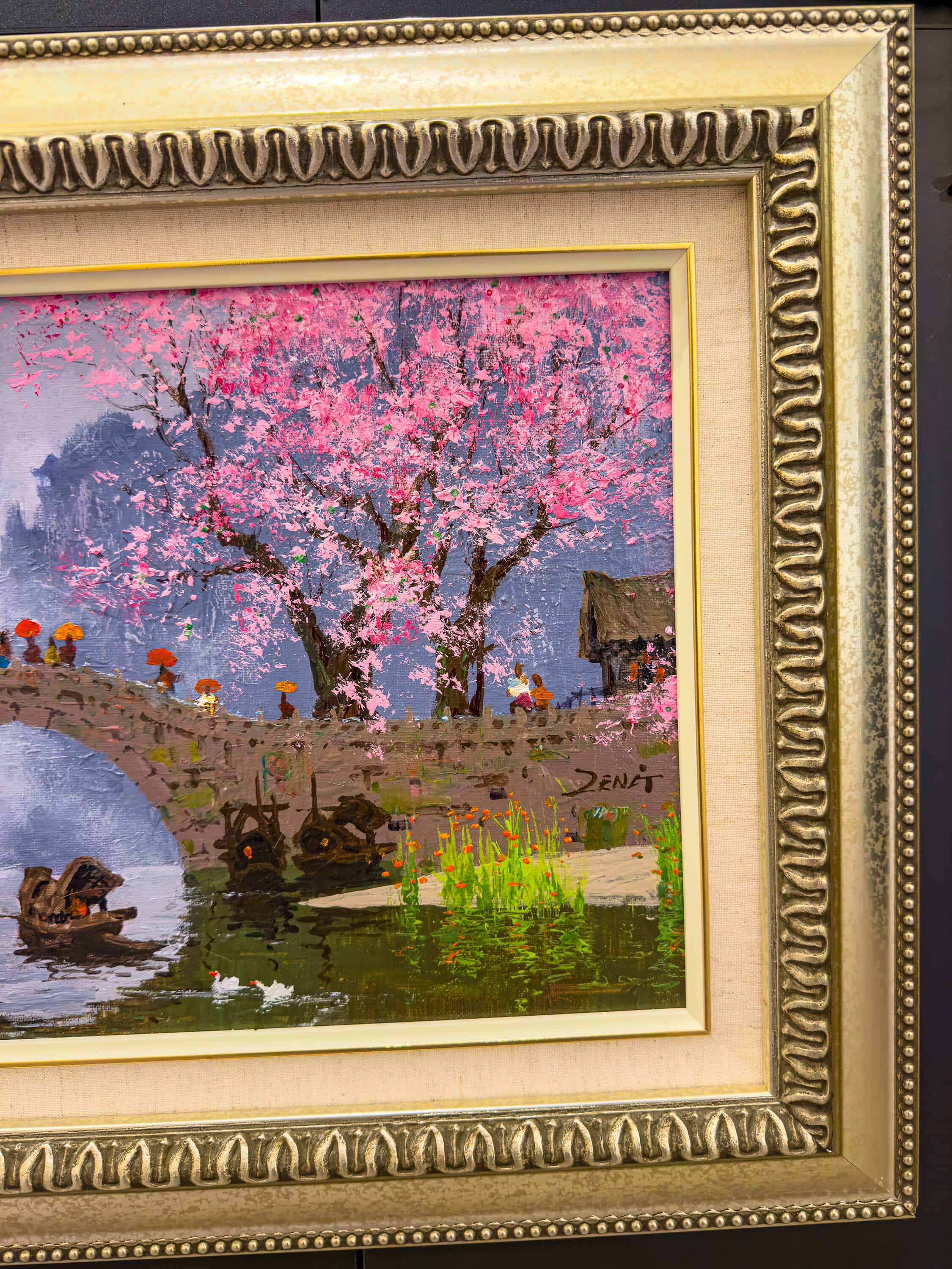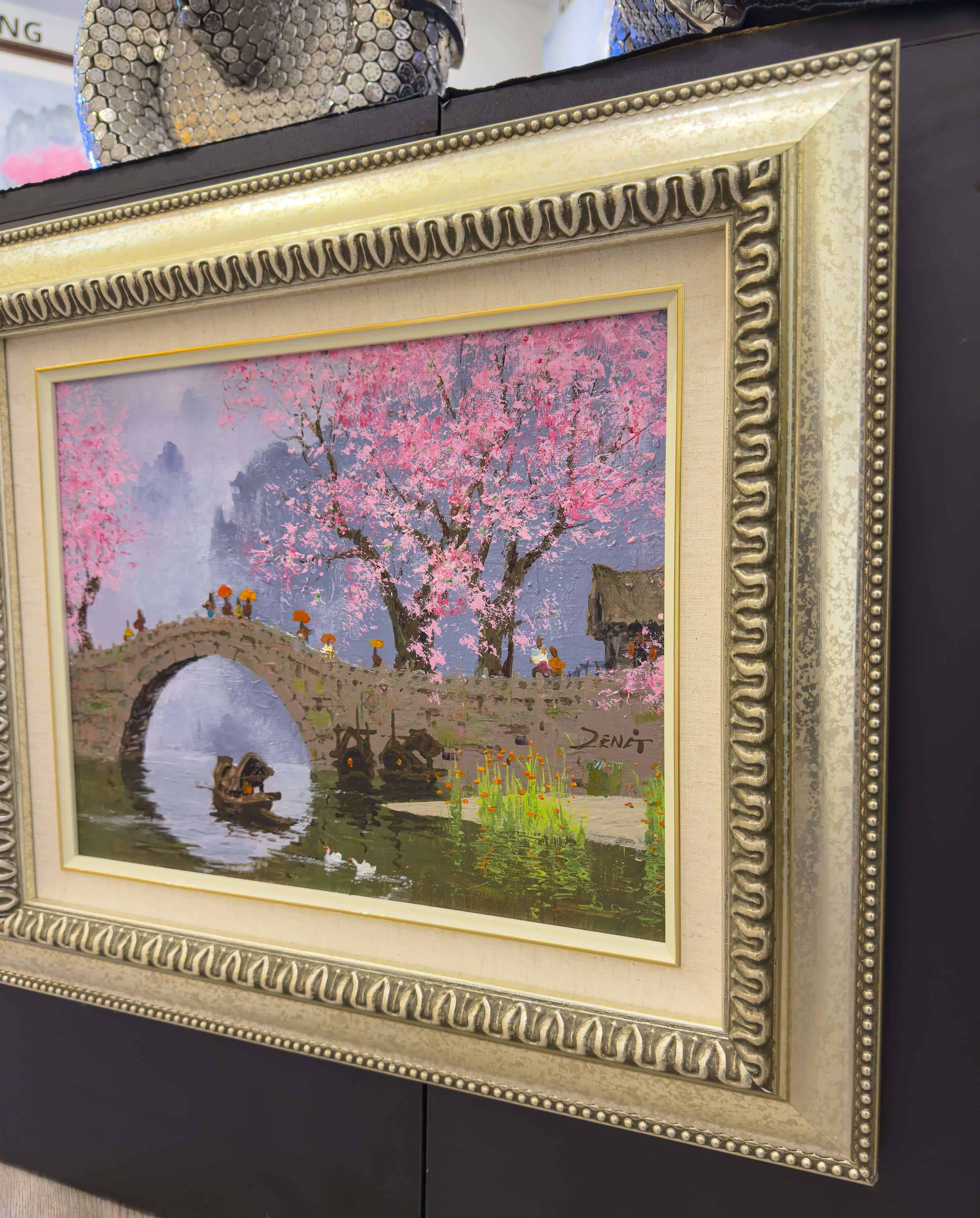 Blossom Bridge II presents a tranquil spring scene where a stone bridge gently arches over still water, framed by blooming cherry trees in soft shades of pink. Subtle reflections ripple across the surface, while delicate brushwork brings balance between structure and nature. The composition evokes a sense of calm passage—both physical and emotional—inviting the viewer to linger in a moment of seasonal beauty, harmony, and quiet contemplation.
