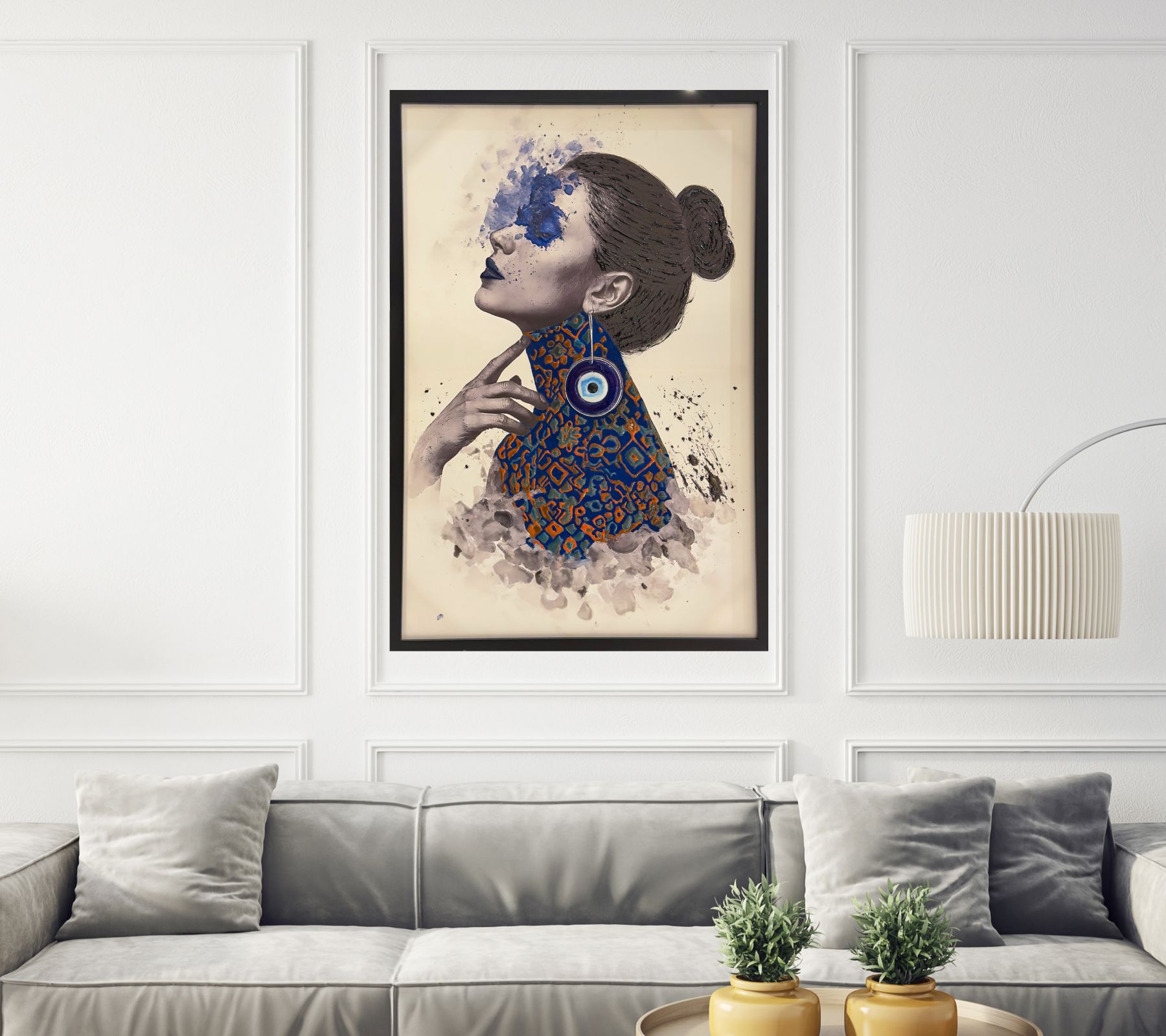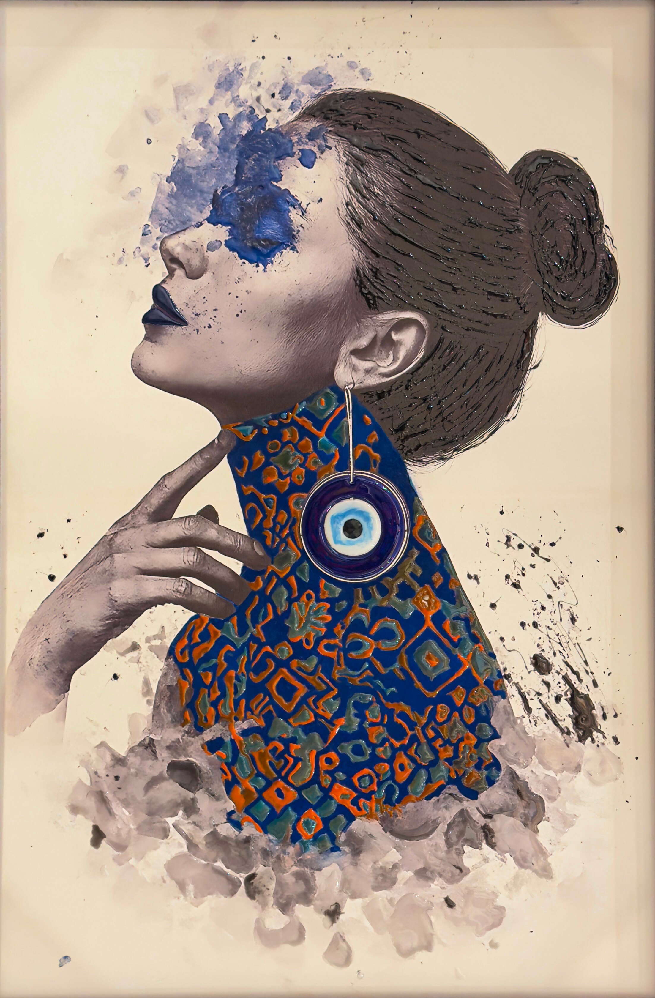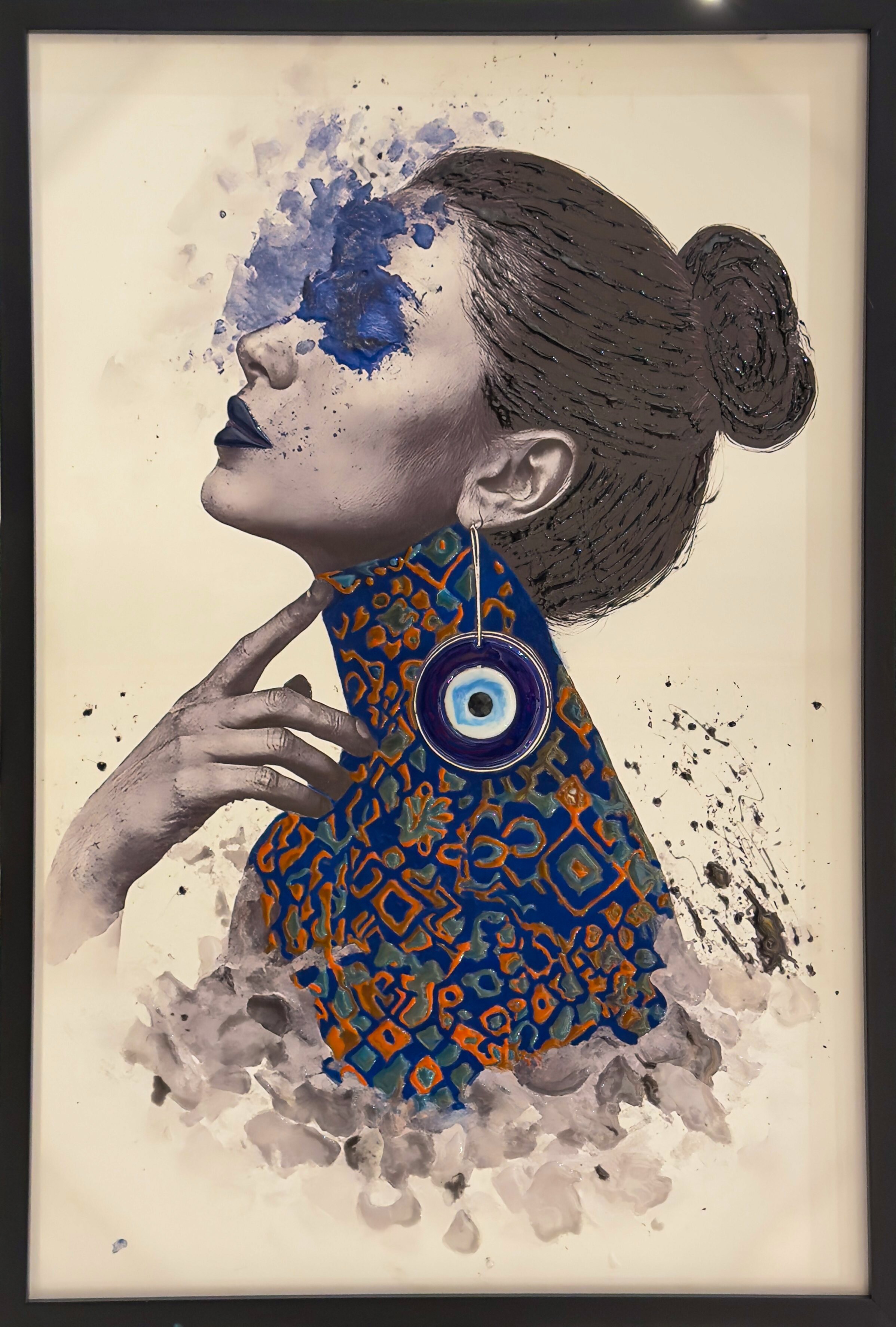 Blue Vision explores heightened perception and inner awareness through a bold contrast of color and form. The vivid blue element over the eye suggests intuition beyond the physical gaze, while layered resin textures and patterned surfaces evoke movement between the seen and unseen. The composition captures a moment of quiet awakening, where perception becomes both personal and expansive.