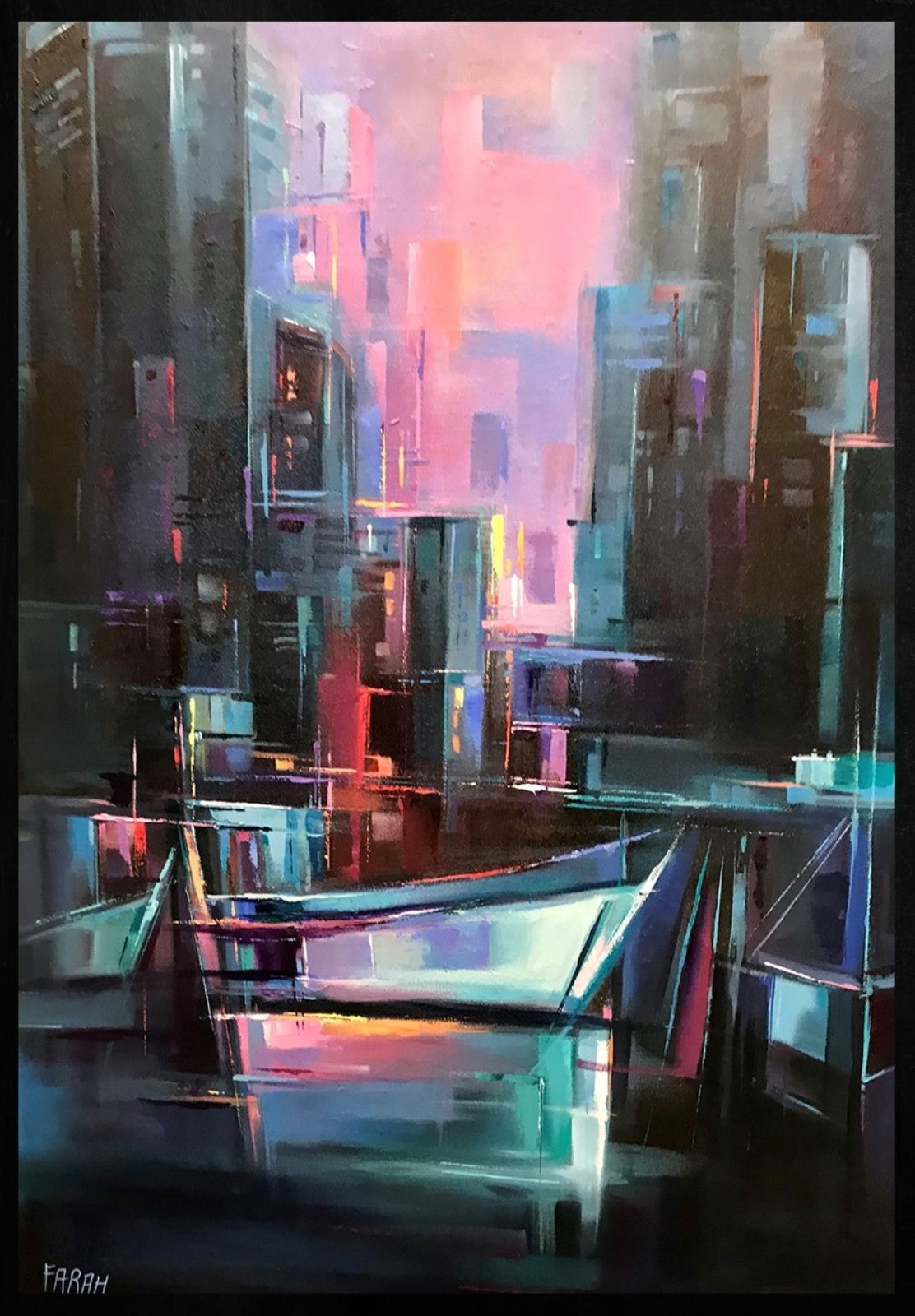 Farahnaz Samari interprets the harbour as a living field of light and movement. Planes of color intersect with reflective surfaces, dissolving the boundaries between skyline, water, and structure. Boats and architectural fragments appear suspended within radiance, creating a sense of depth that is both spatial and emotional.