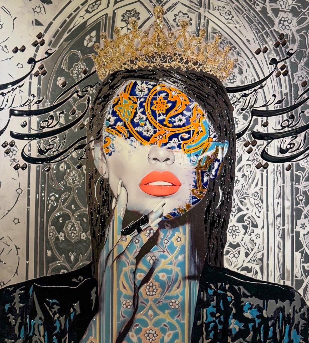 Crowned Silence portrays a moment of quiet authority, where inner power is held in stillness rather than display. The crowned figure emerges through layered patterns, resin textures, and ornamental motifs that partially veil the face, suggesting wisdom beyond sight. Gold accents and intricate surfaces elevate the composition, reflecting a sense of sovereignty rooted in introspection and restraint.