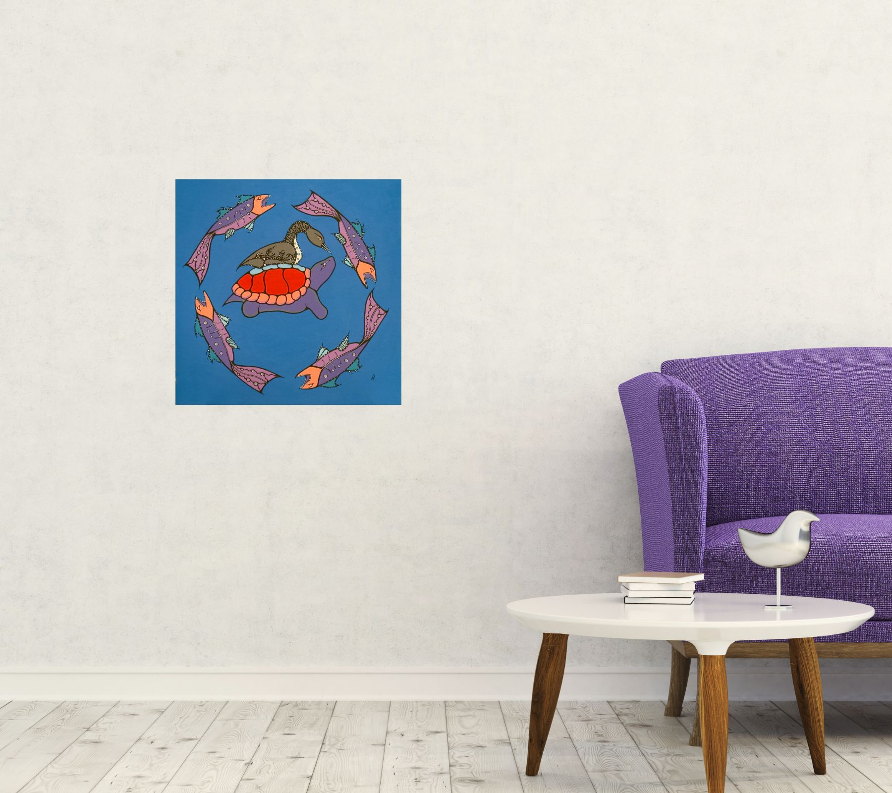 At the center, the turtle represents stability and longevity, while the bird introduces awareness and connection to the spiritual realm. Together, they anchor the composition, surrounded by fish that embody movement, sustenance, and the rhythms of nature.