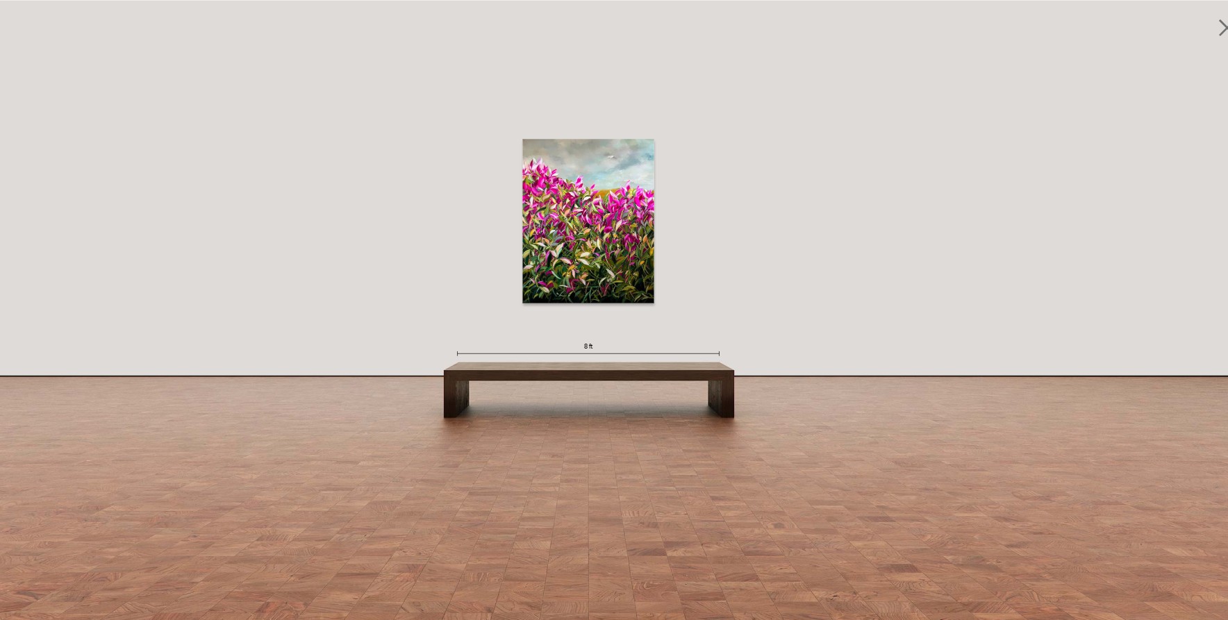 In this vibrant floral abstraction, Thompson brings forth a lush field of magenta and rose-pink foliage rising against a soft, misty sky. Her sweeping brushwork and layered tones of green, blush, and gold create a dynamic sense of movement—like leaves shimmering in warm southern light.