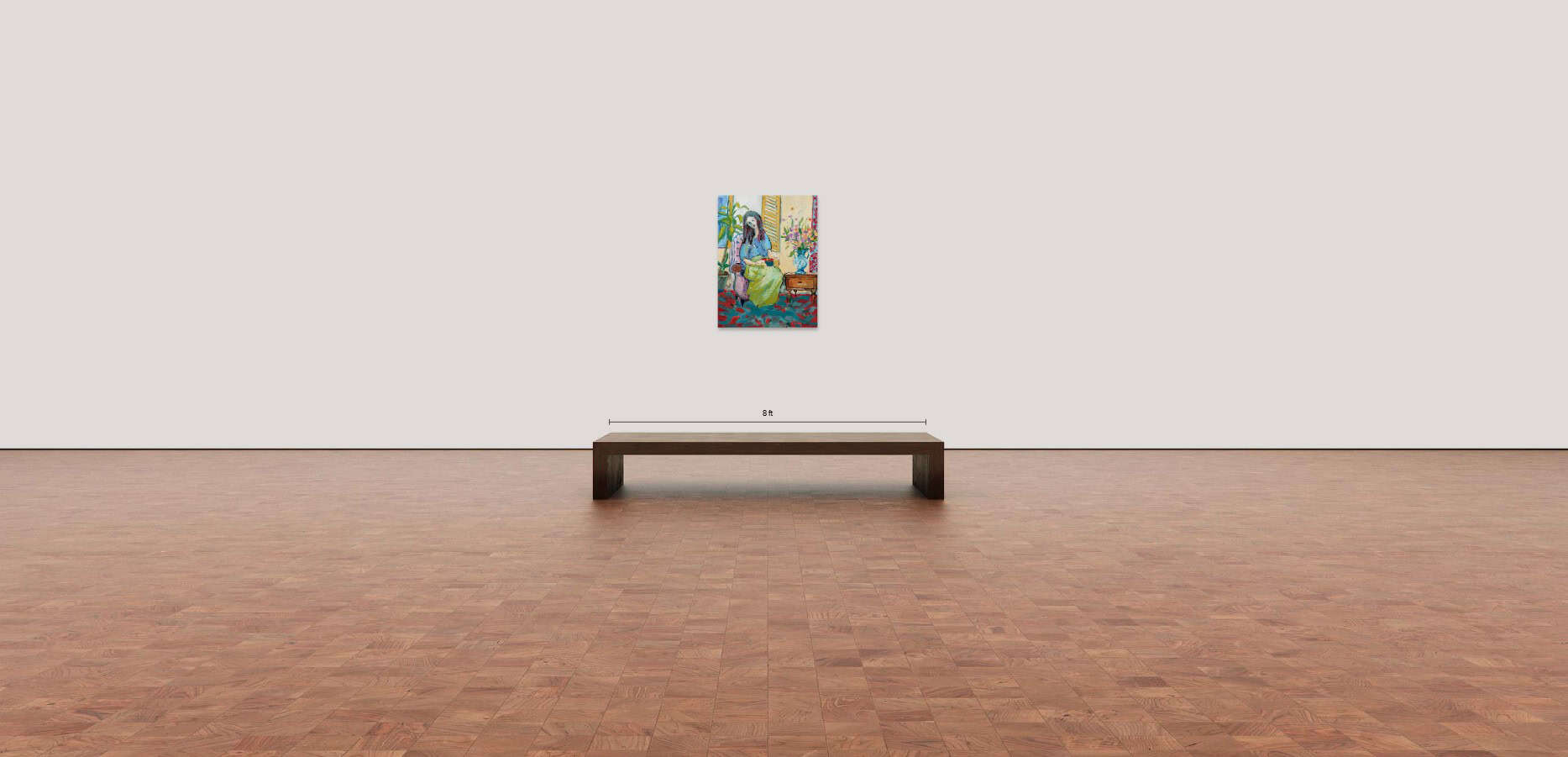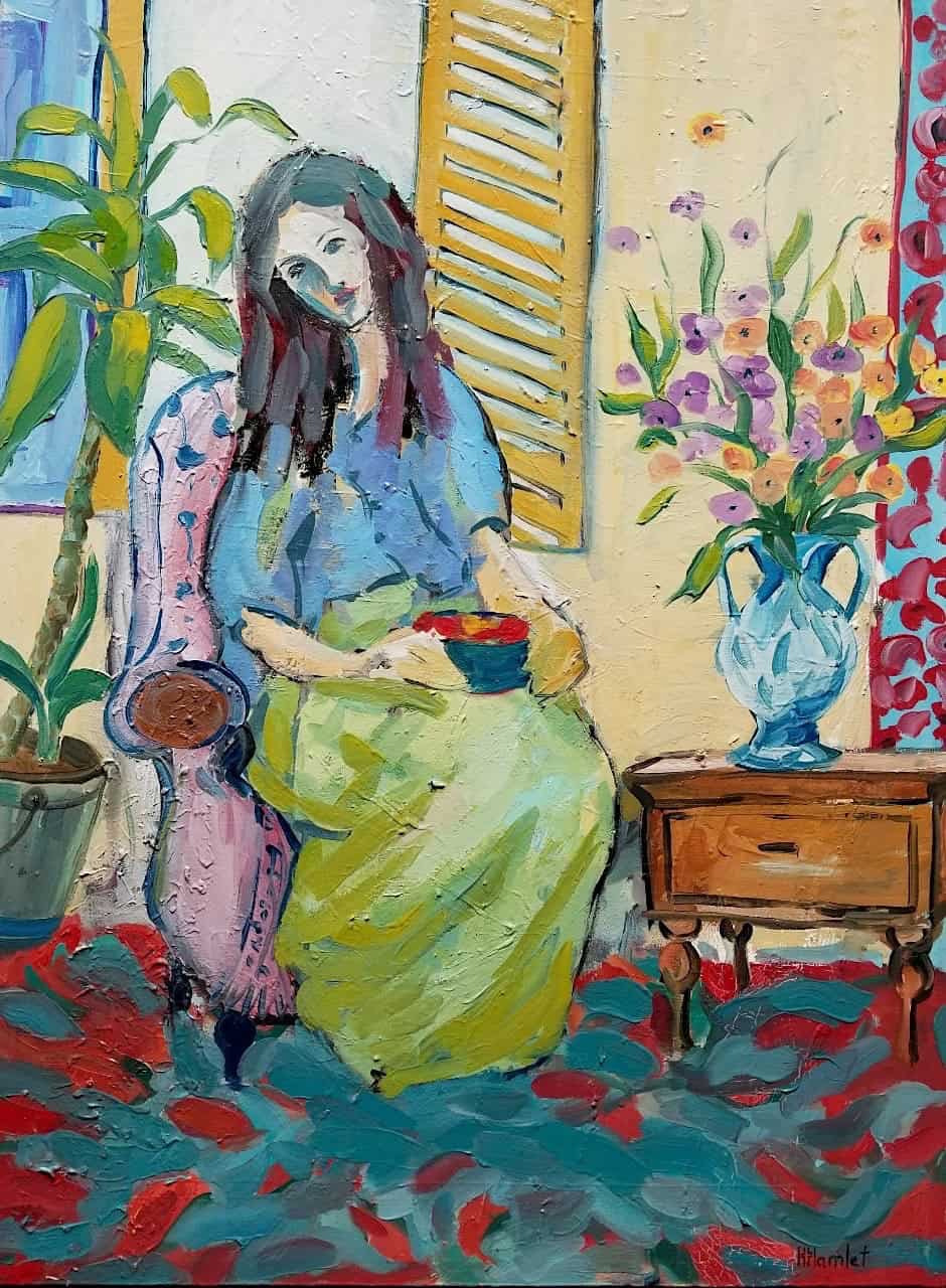 Rich color and expressive brushwork bring this intimate figurative interior into gentle presence. The seated figure is enveloped by light, pattern, and surrounding still life elements, creating a quiet atmosphere where space feels both structured and emotionally resonant. Gesture and color merge to convey stillness filled with subtle anticipation.