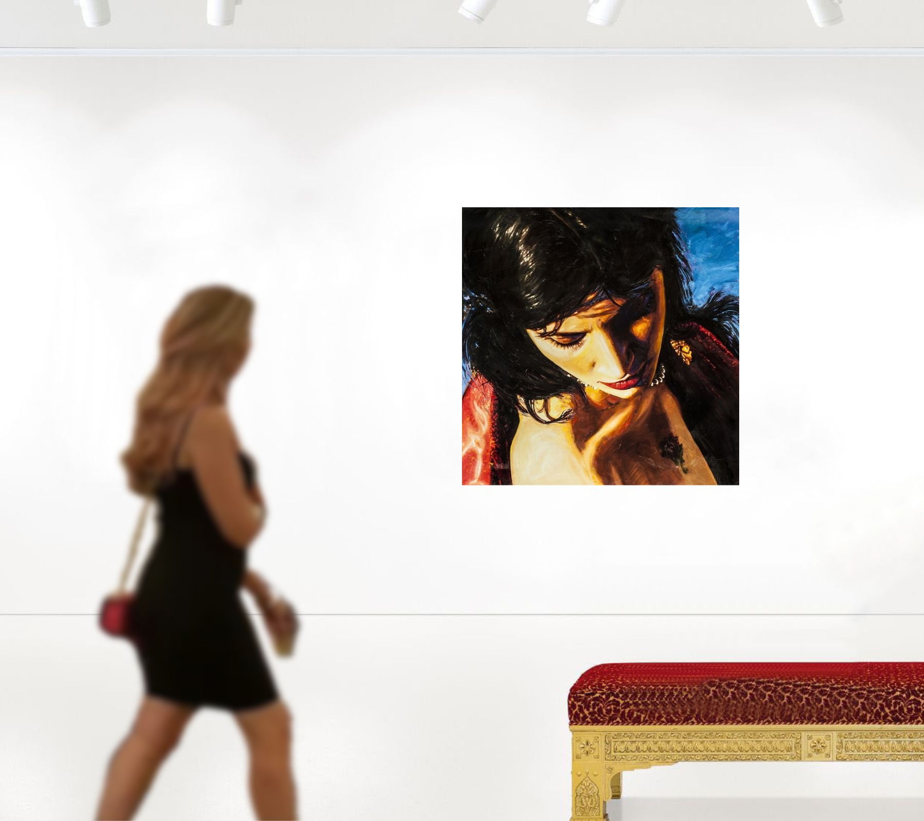 Feeling captures an intimate moment of quiet vulnerability. The woman’s lowered gaze, shadowed features, and glowing skin tones create an atmosphere of emotional depth and introspection. Rich, expressive brushstrokes heighten the contrast between light and darkness, revealing the inner world behind the elegant exterior. This powerful portrait speaks to sensitivity, strength, and timeless femininity.
