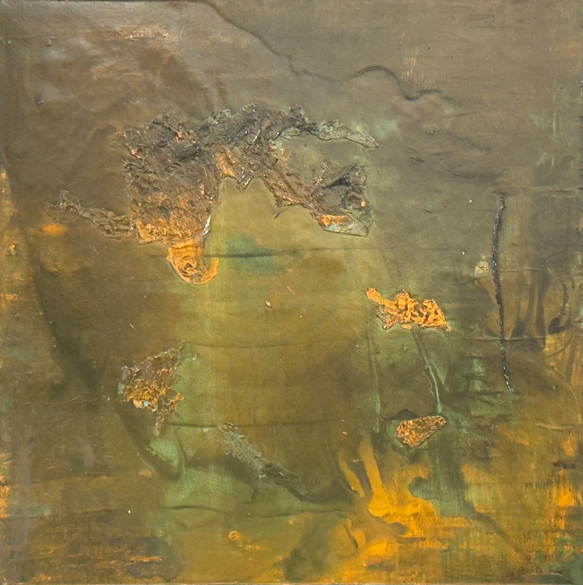 Forbidden is a contemplative mixed media work that explores tension, restraint, and the presence of boundaries—both internal and external. Layers of earthy greens, muted ochres, and weathered textures form a surface that feels guarded and unsettled, as if something has been concealed, interrupted, or deliberately withheld. Fragmented forms emerge but never fully resolve, reinforcing a sense of limitation and quiet resistance.