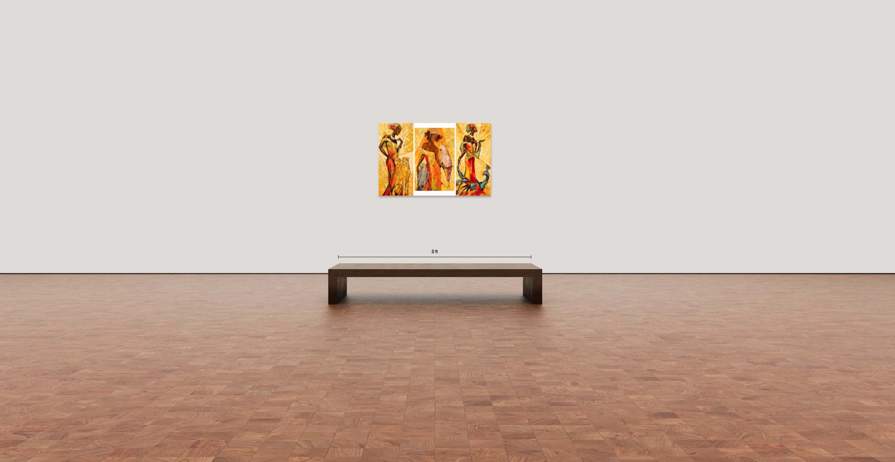 The warm golden palette unifies the composition, while geometric structuring and textured surfaces create depth and elegance. This triptych evokes a sense of cultural richness and timeless femininity, making it both visually striking and conceptually meaningful.