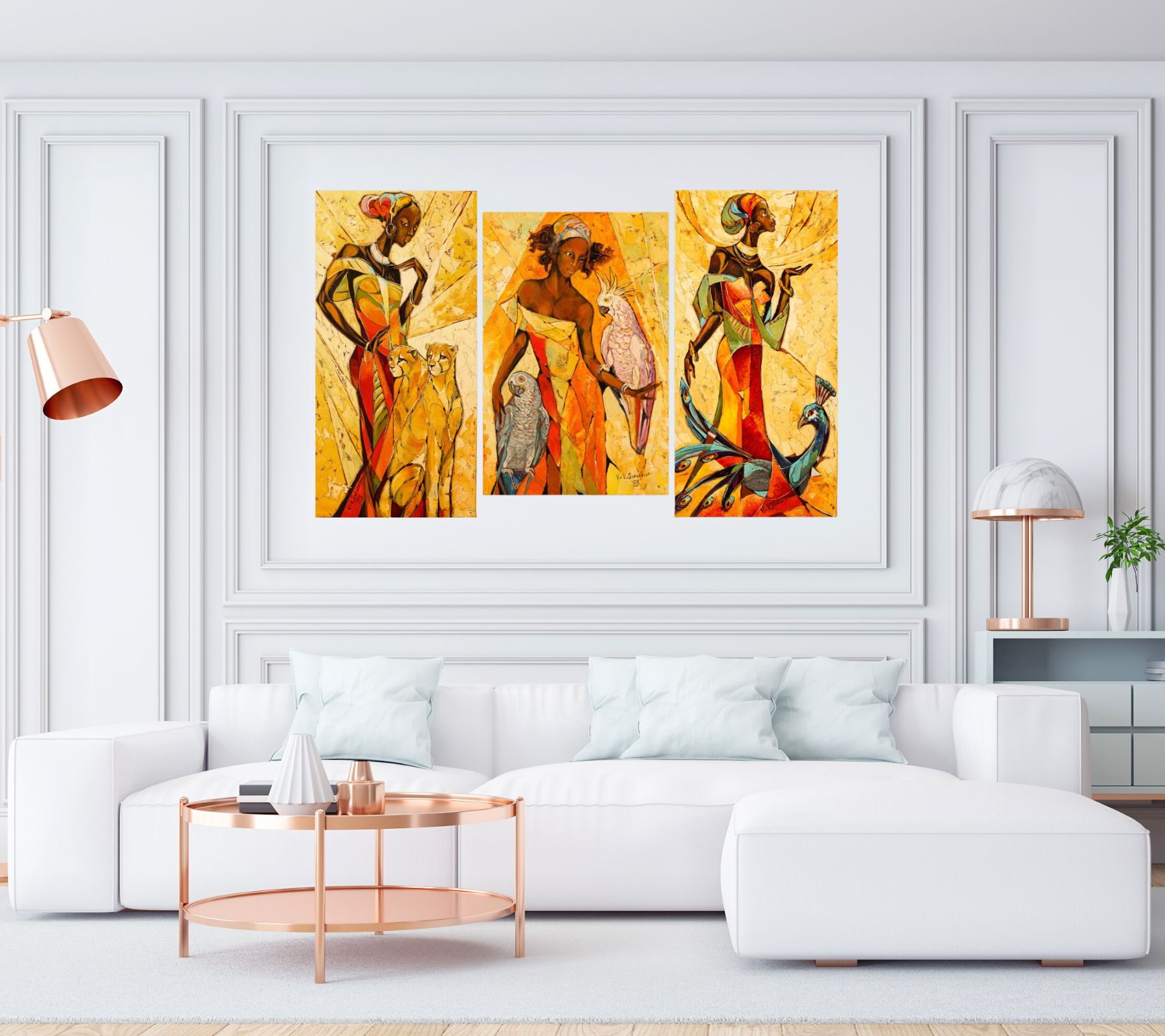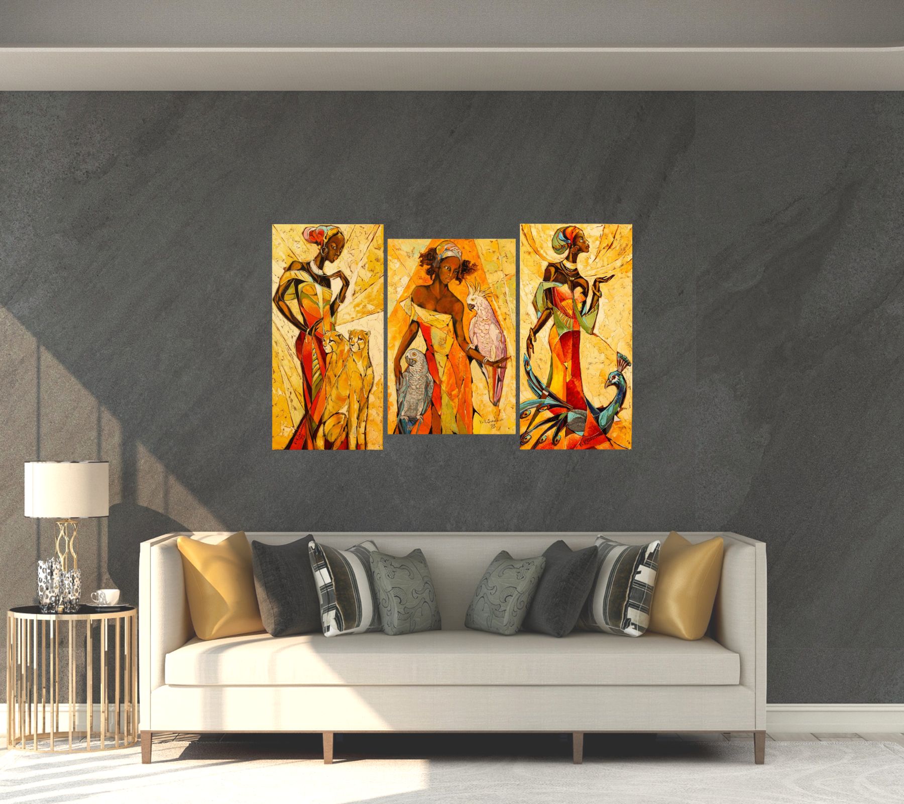 Golden Sun (Triptych) by Valeri Sokolovski presents a powerful narrative of strength, grace, and symbolic harmony. Across three panels, elongated female figures are accompanied by animals—lions, parrots, and a peacock—each representing vitality, wisdom, and beauty.