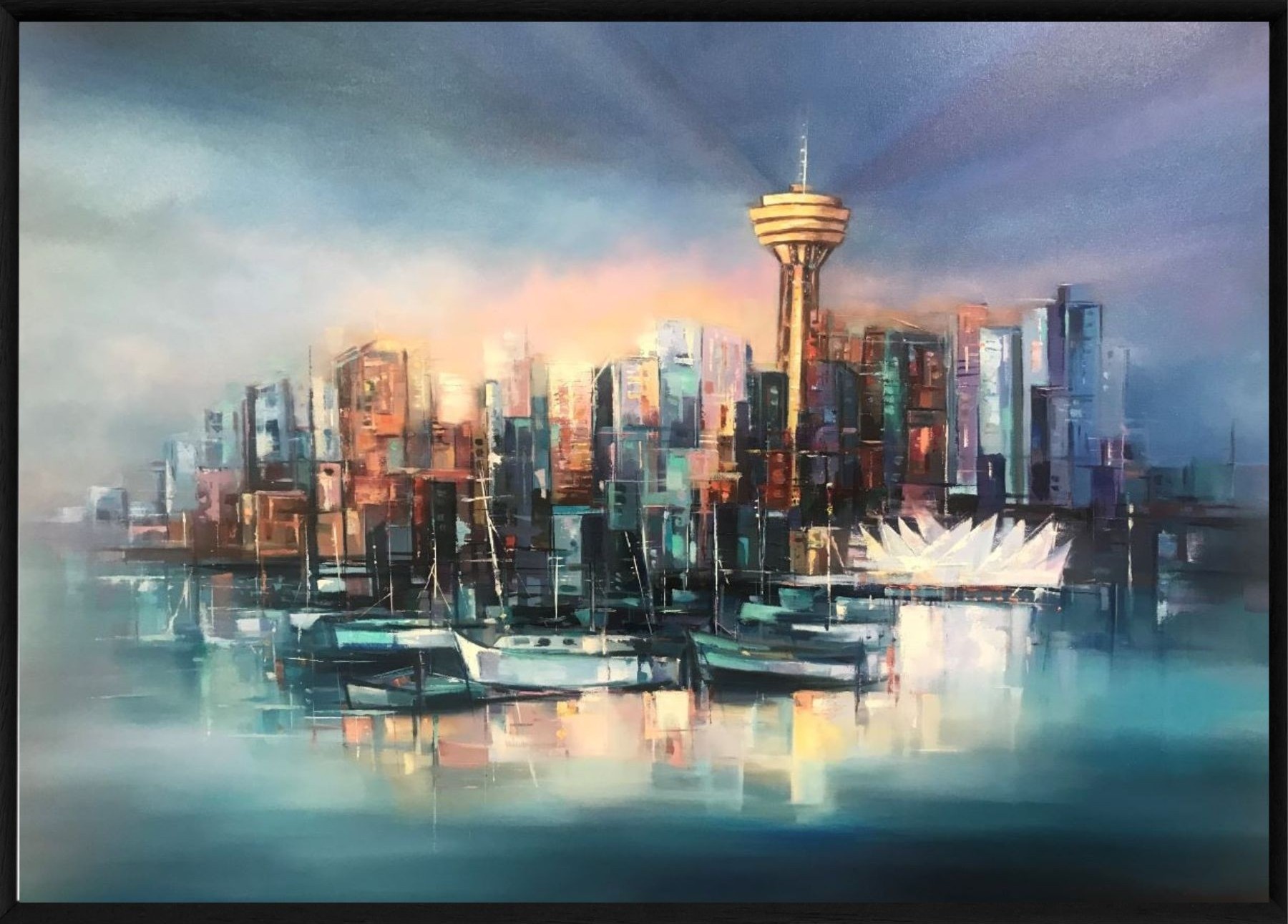 Growing City captures the evolving skyline of Vancouver, where urban energy meets coastal calm. Rising towers glow against a luminous sky, while the harbor below reflects the city’s expanding rhythm in softened, atmospheric light. Familiar architectural forms emerge through color and reflection, suggesting a metropolis in continuous transformation.