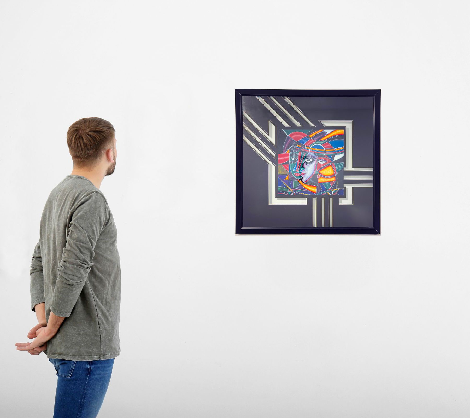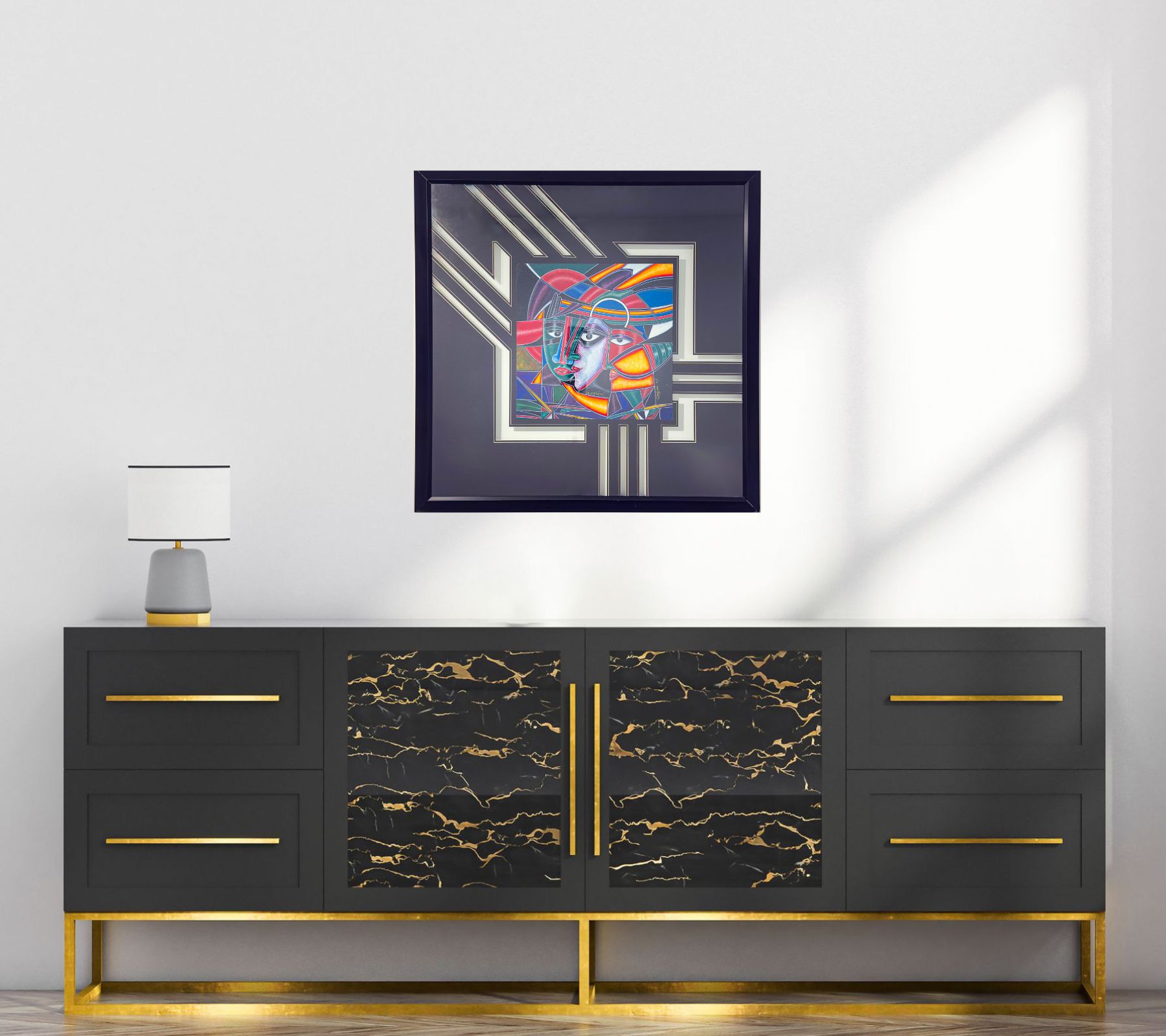 "Ilusion" is a rare and striking original by Latin American artist Juan Quevedo, showcasing his signature fusion of Cubism, geometry, and radiant color. Painted in watercolor and mixed media on paper, the work unfolds like a multifaceted portrait—two faces intertwined, revealing shifting perspectives, emotion, and depth.