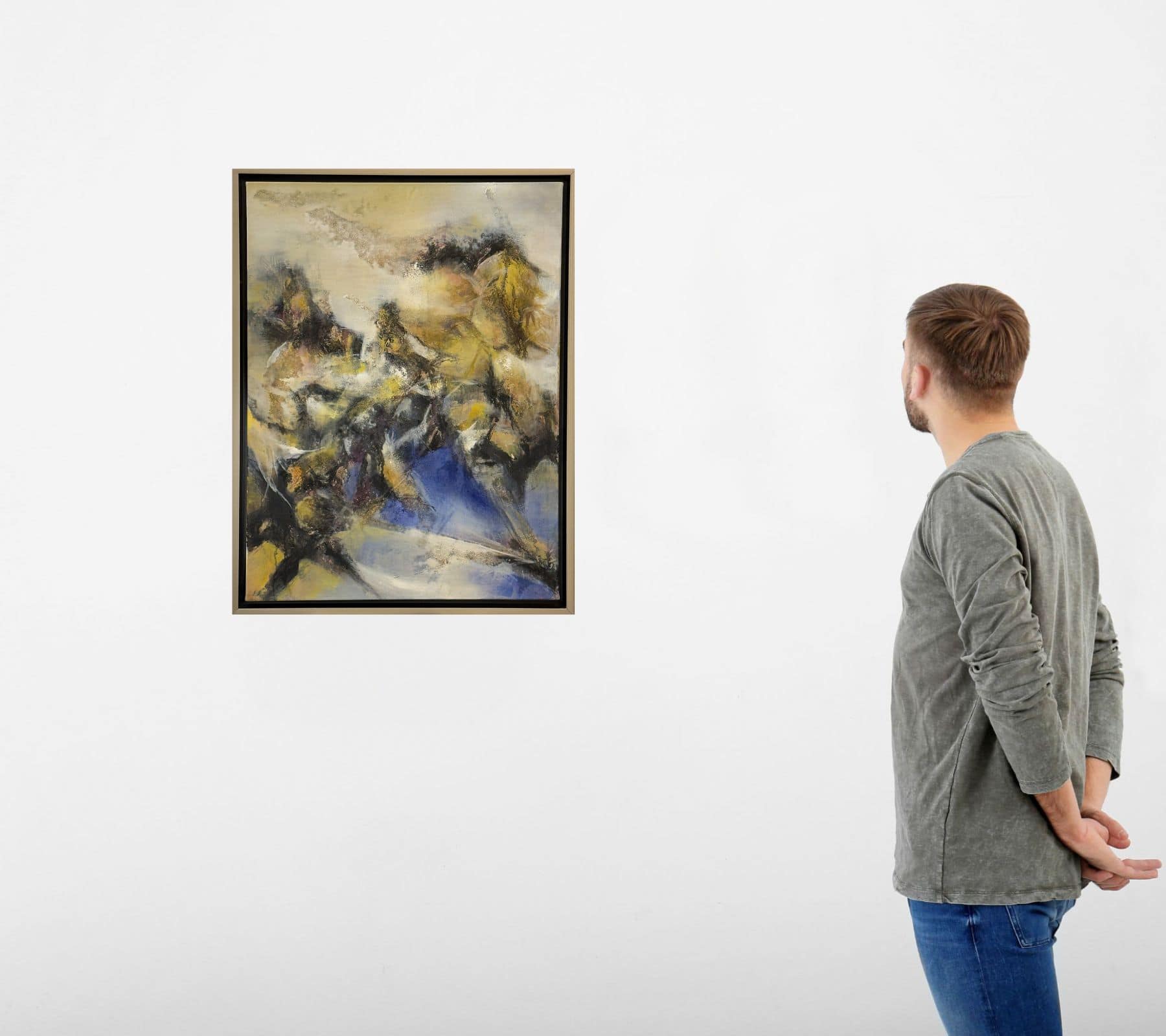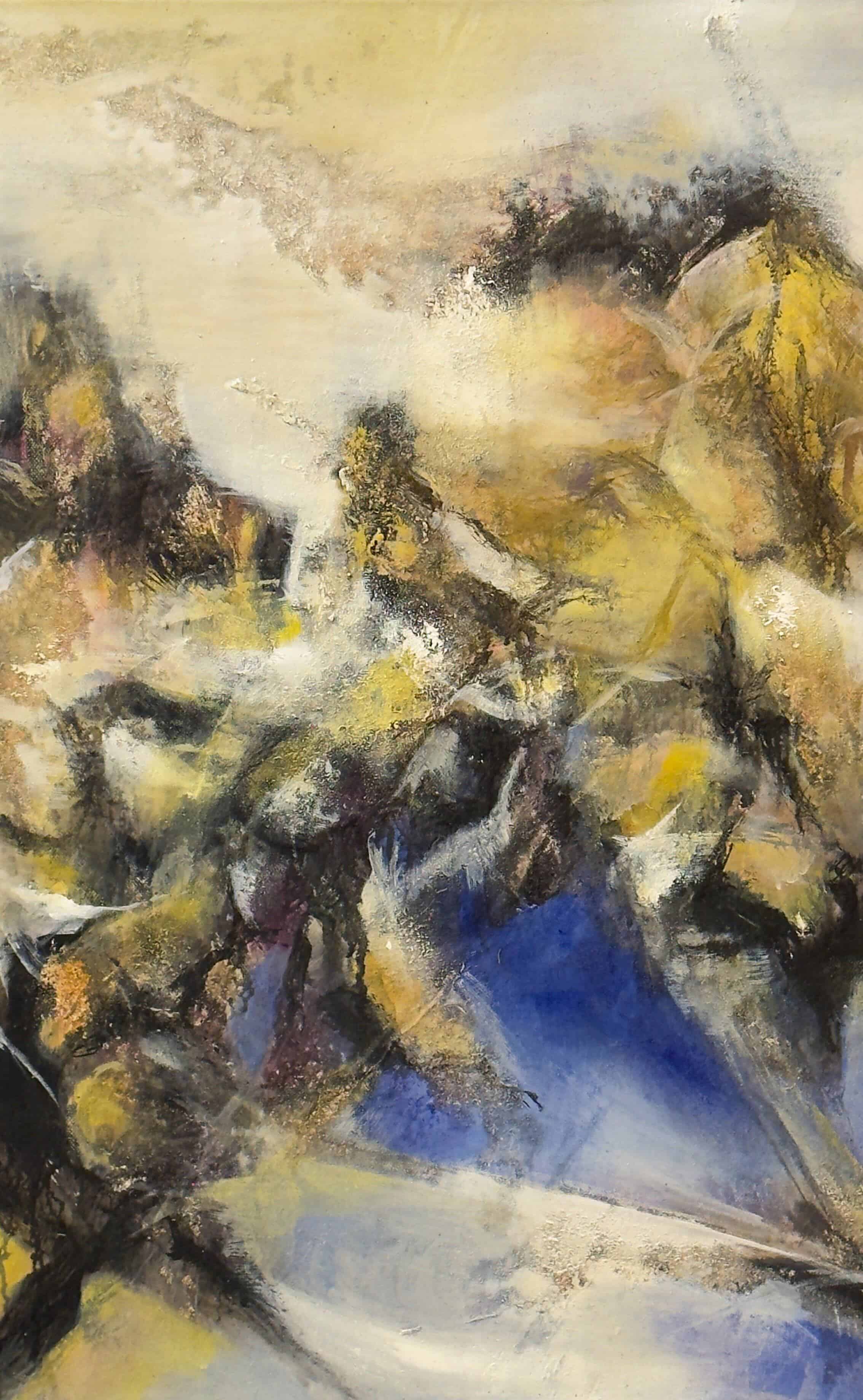 Join & Discrete Five Elements YZ11 unfolds through a dynamic interplay of movement, texture, and layered color. Earthy tones of gold, ochre, and deep blue merge with gestural forms that appear to emerge and dissolve across the surface, suggesting the constant transformation of natural forces.