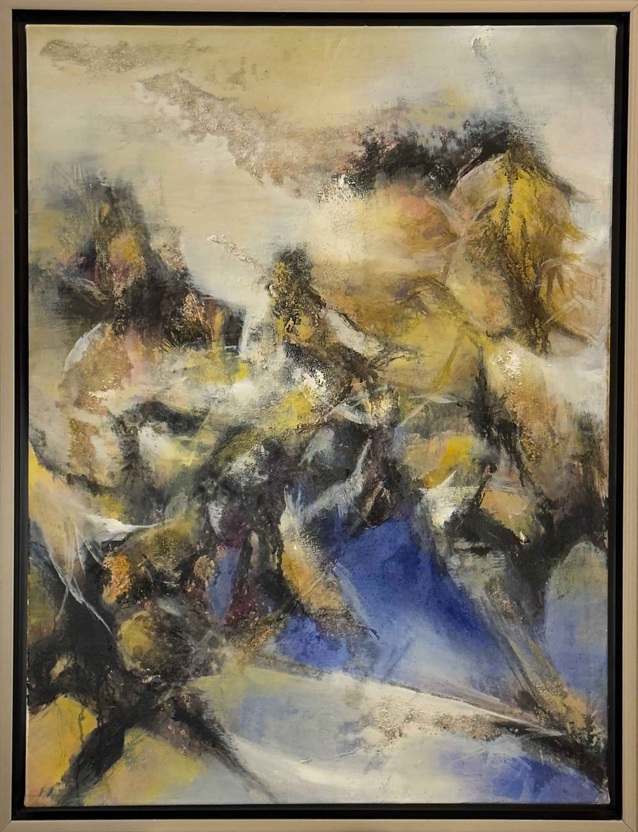 The composition reflects the artist’s exploration of the Five Elements philosophy, where energy flows through interconnected forms and shifting structures. Through layered mixed media techniques, the surface reveals depth and atmospheric transitions that evoke both landscape and cosmic motion.