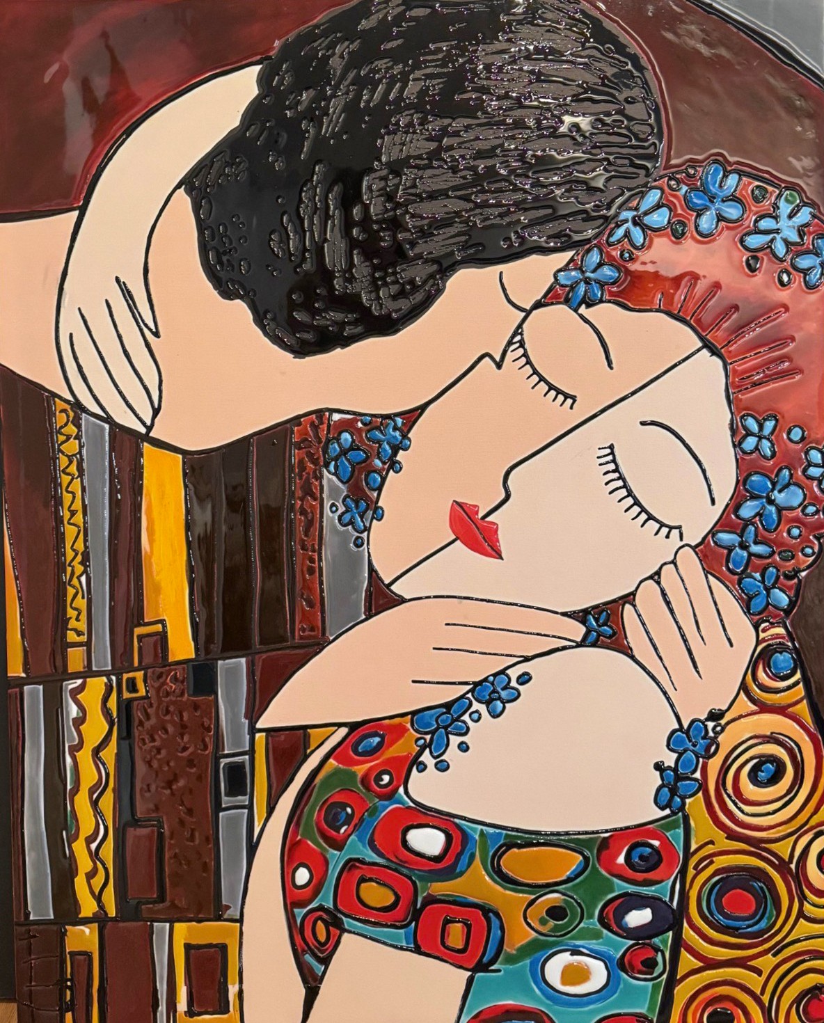 Kiss captures an intimate moment suspended in time. Two figures merge in a quiet embrace, their closed eyes and softened forms expressing tenderness, trust, and emotional closeness. The interplay of bold patterning, rhythmic color blocks, and glossy resin surfaces transforms a private gesture into a universal language of love—where connection is felt rather than spoken.