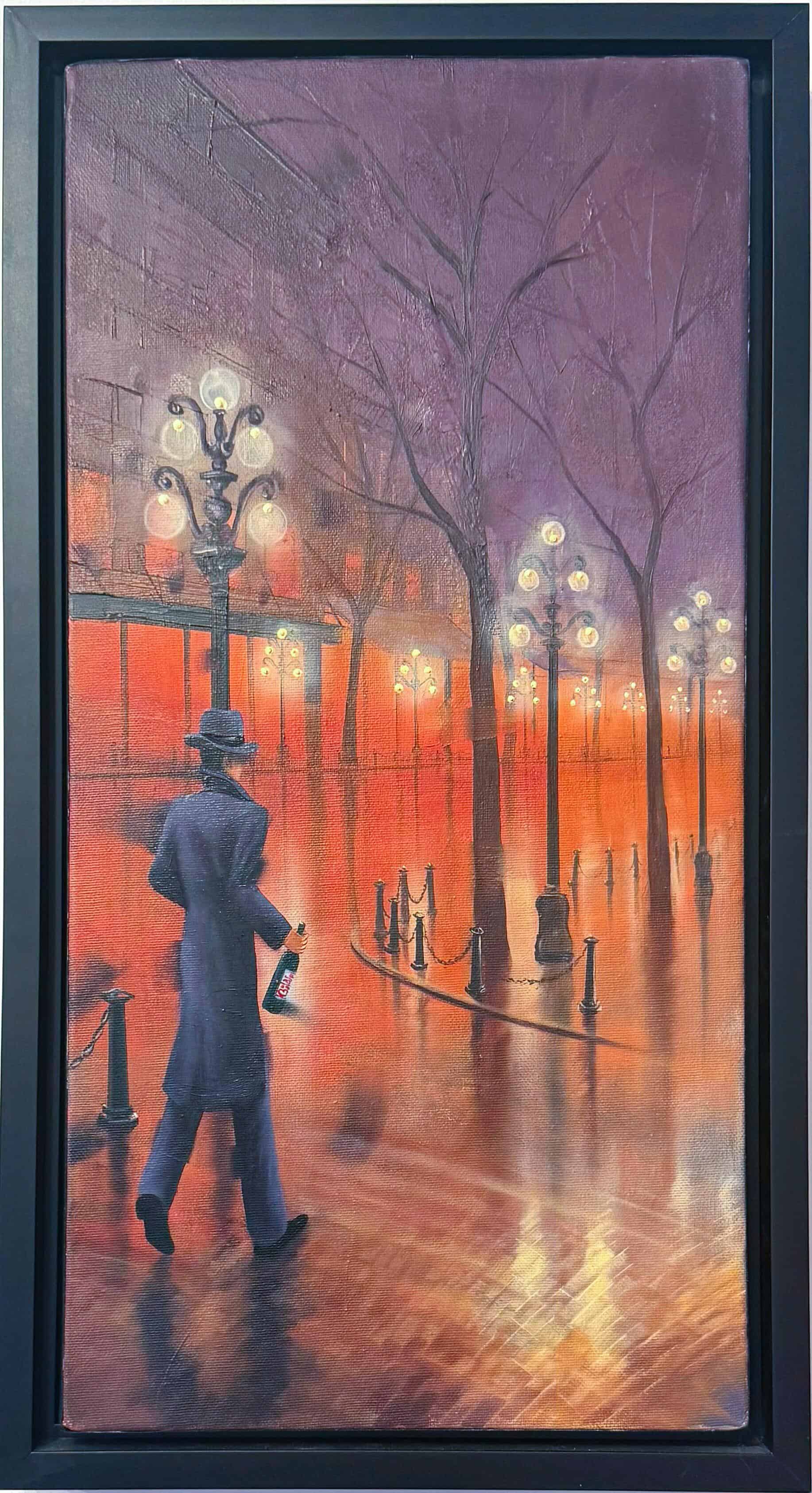 A lone figure in a long coat walks through the rain-soaked street, bottle in hand, illuminated by rows of iconic street lamps.