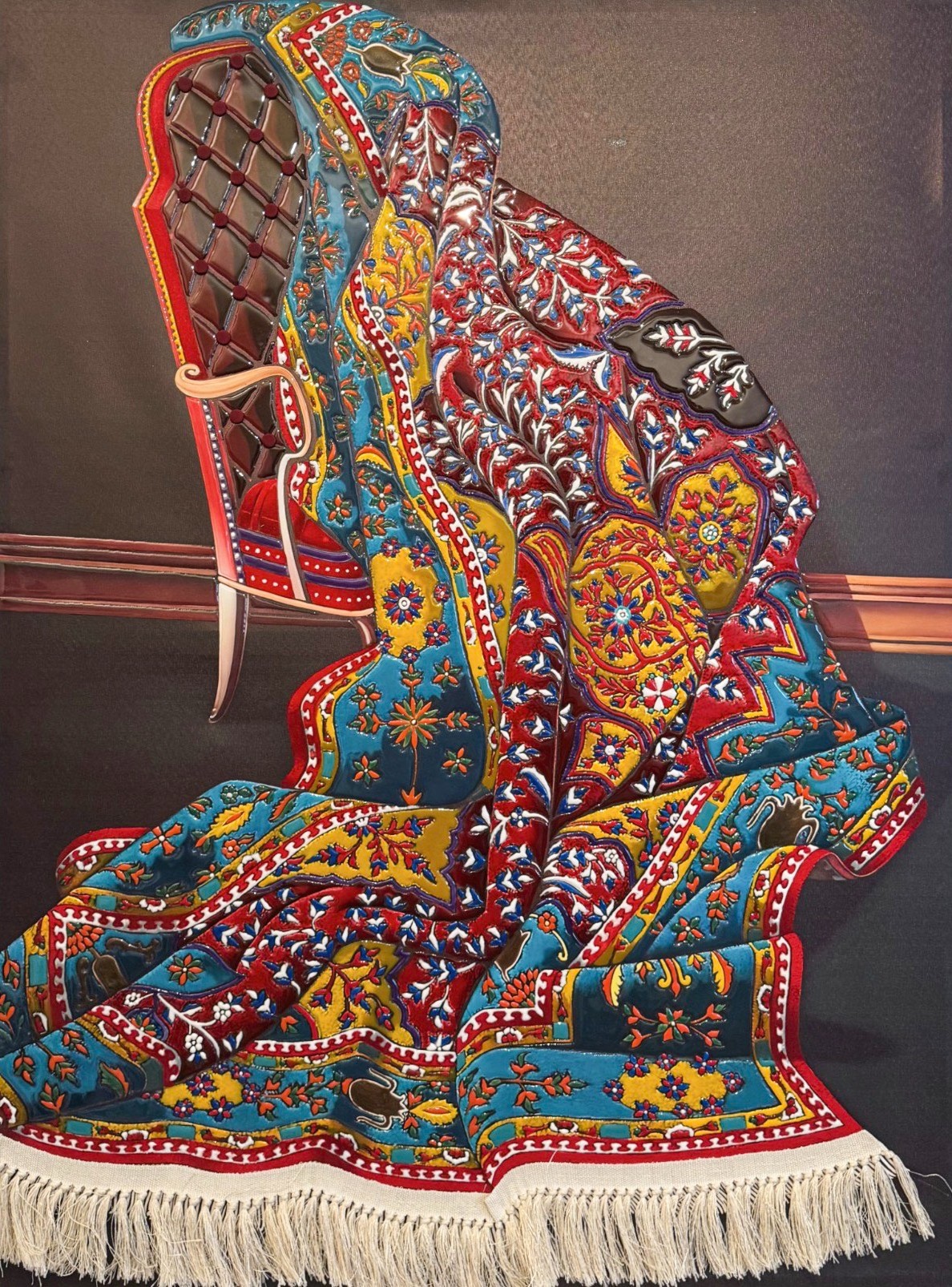 Persian Rug transforms a richly patterned textile into a symbol of memory, shelter, and continuity. Draped over a sculptural chair, the intricate motifs and layered resin textures suggest warmth, history, and lived experience. The work evokes a sense of quiet presence—where objects become vessels of identity, carrying stories across time and space.
