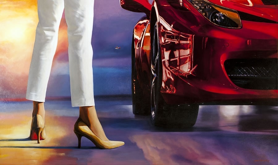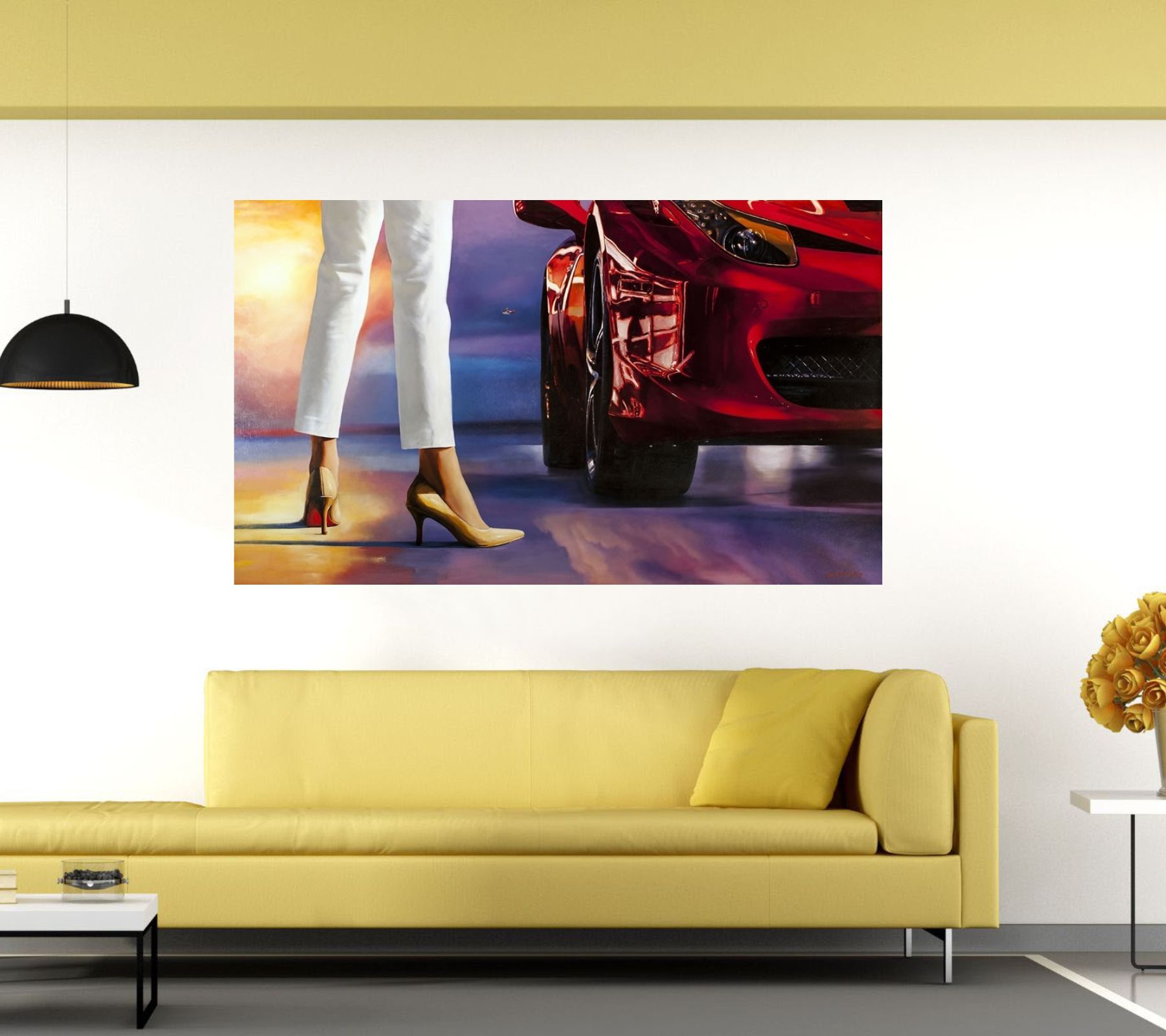 Red Ferrari captures a cinematic moment of modern elegance and power. The composition focuses on the contrast between the refined figure in heels and the bold presence of the red Ferrari. Reflections, lighting, and color harmony create a sense of movement, luxury, and anticipation. Sheversky masterfully transforms fashion, desire, and speed into a striking visual narrative filled with energy and sophistication.