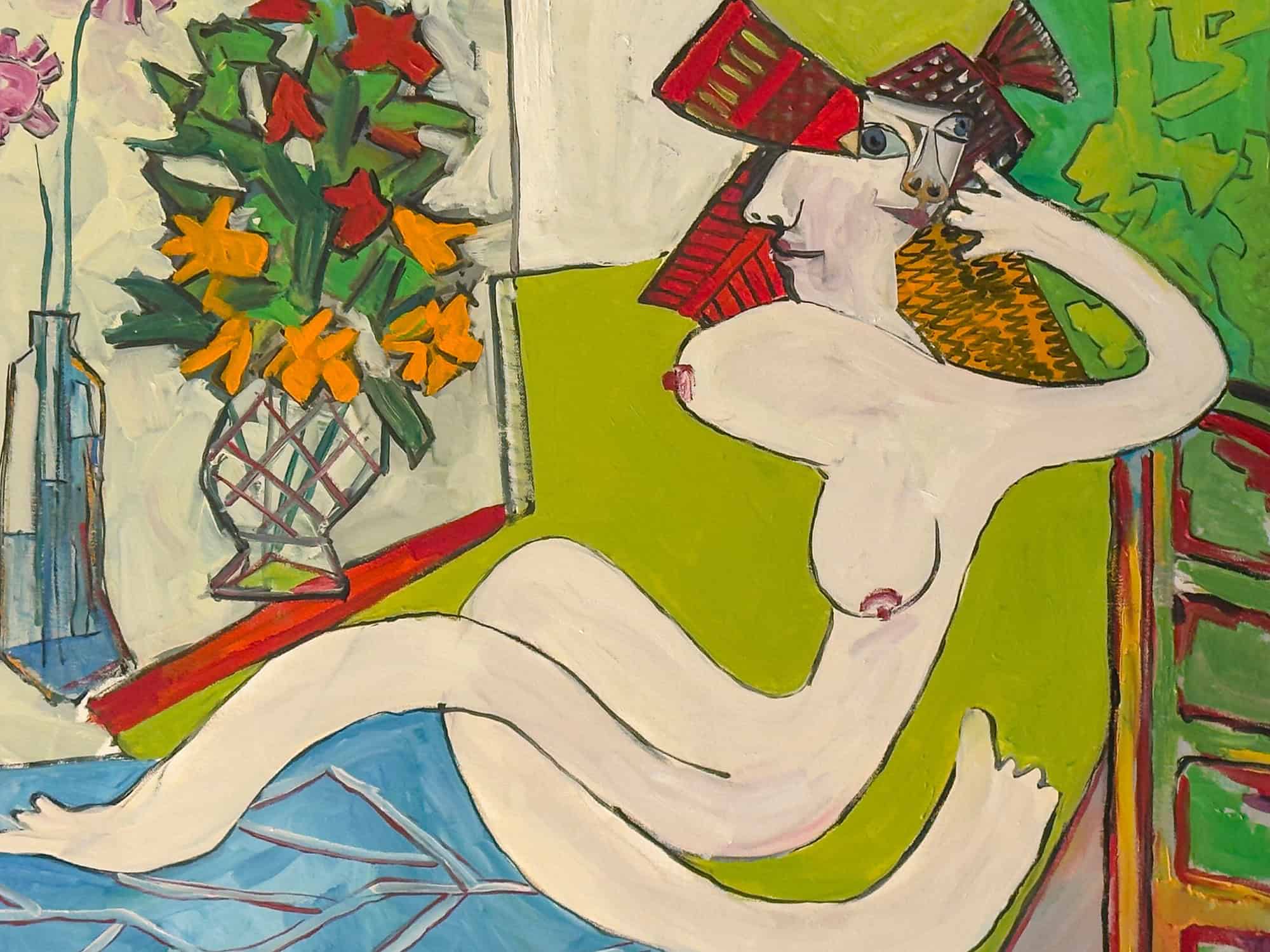 Rich color and expressive brushwork bring this intimate figurative composition into vivid presence. The reclining figure unfolds within a structured interior space, where layered forms and bold color planes create a dialogue between physical presence and psychological perception. The dual facial imagery suggests multiplicity — identity seen, concealed, and continuously shifting.