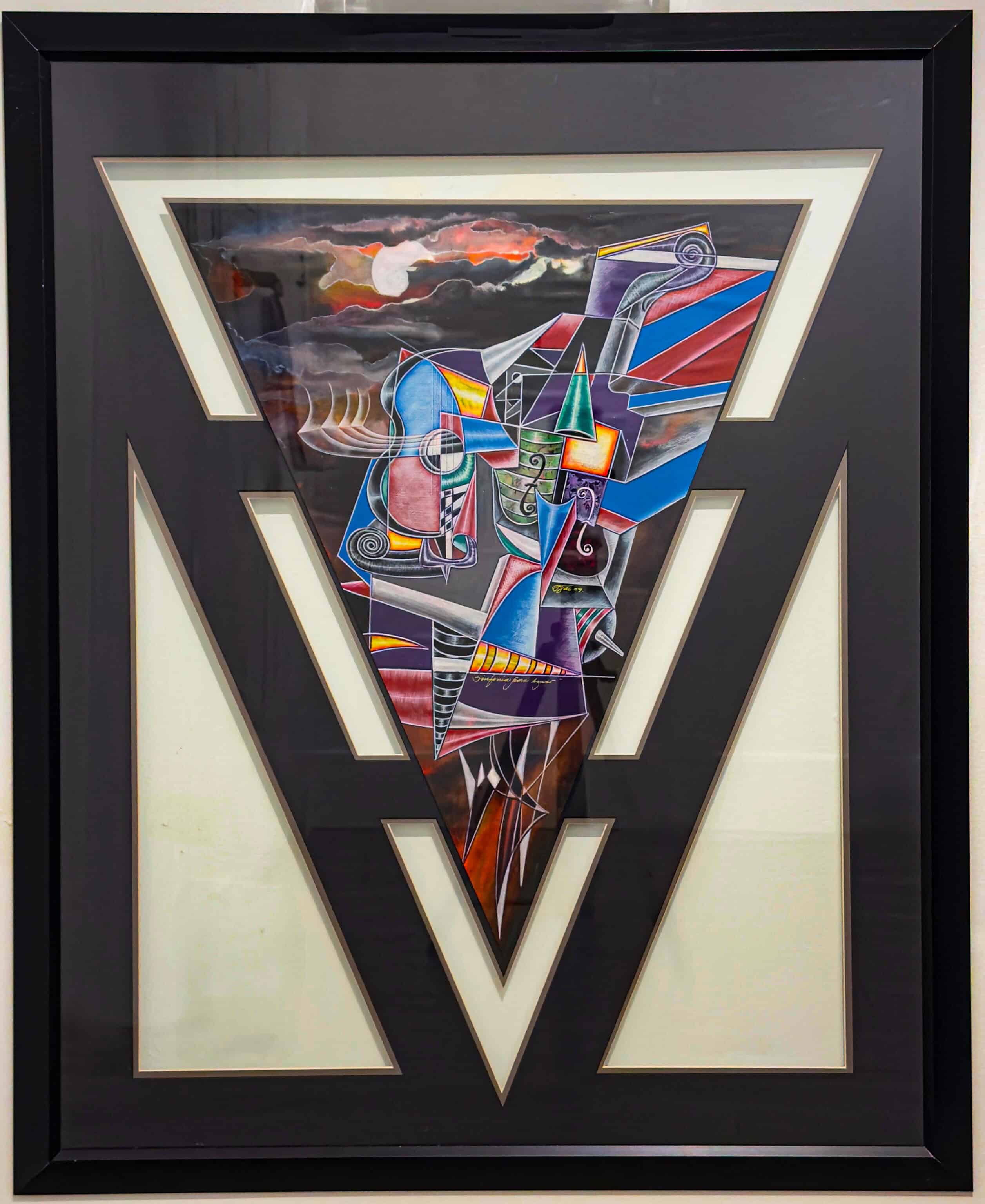 Sinfonia Para Amor is an exceptional mixed-media watercolor by Latin American artist Juan Quevedo, presented in a dramatic custom frame that echoes the rhythmic geometry of the composition.