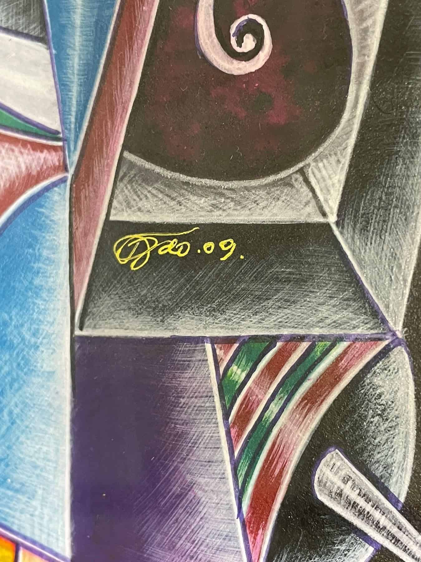 In this work, Quevedo orchestrates a vibrant visual symphony: angular forms, musical curves, and prismatic color planes intertwine against a moody sky, evoking movement, passion, and emotional harmony. The triangular composition heightens the sense of depth and intensity, drawing the viewer into a world where music and abstract portraiture merge.