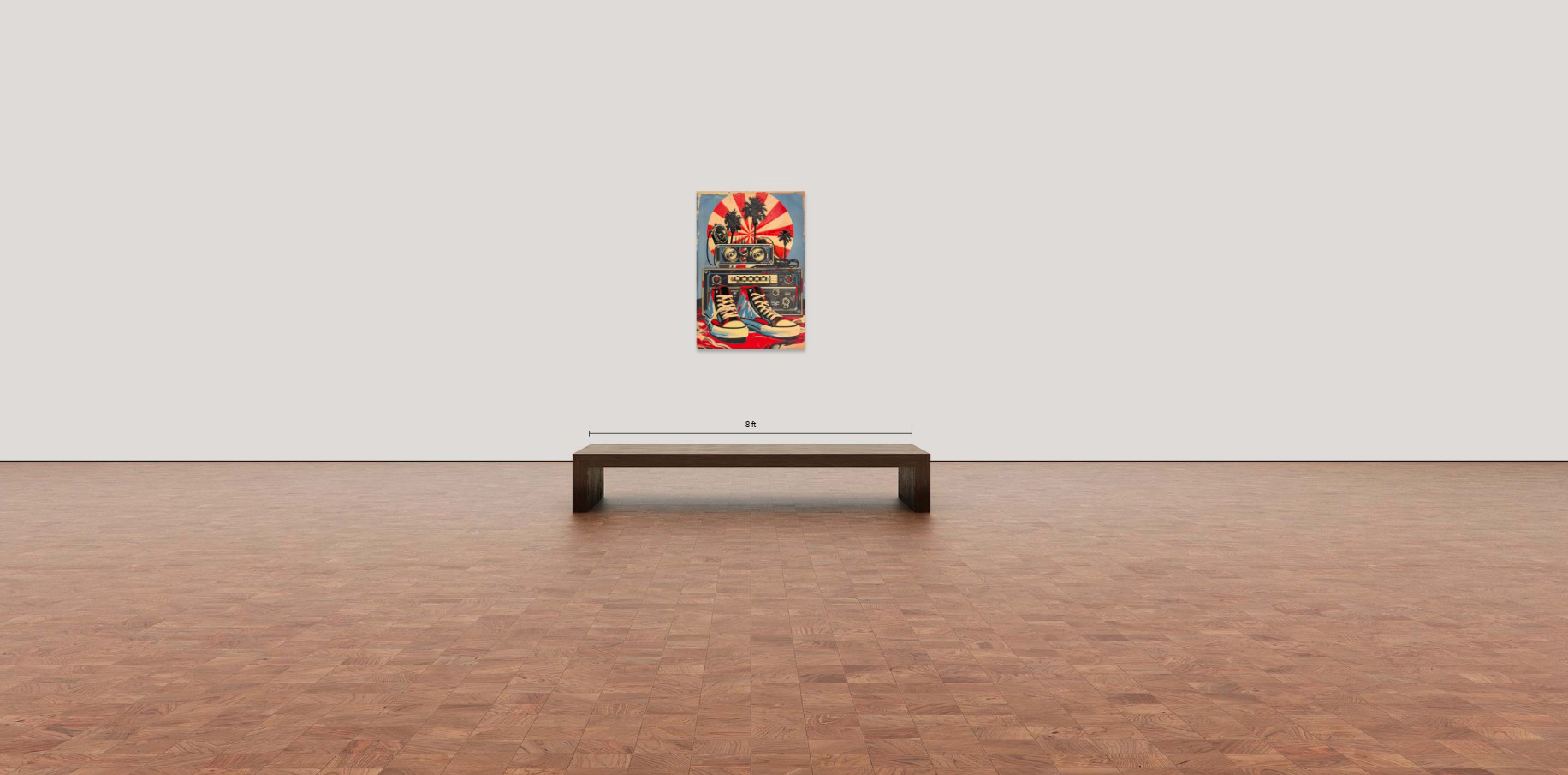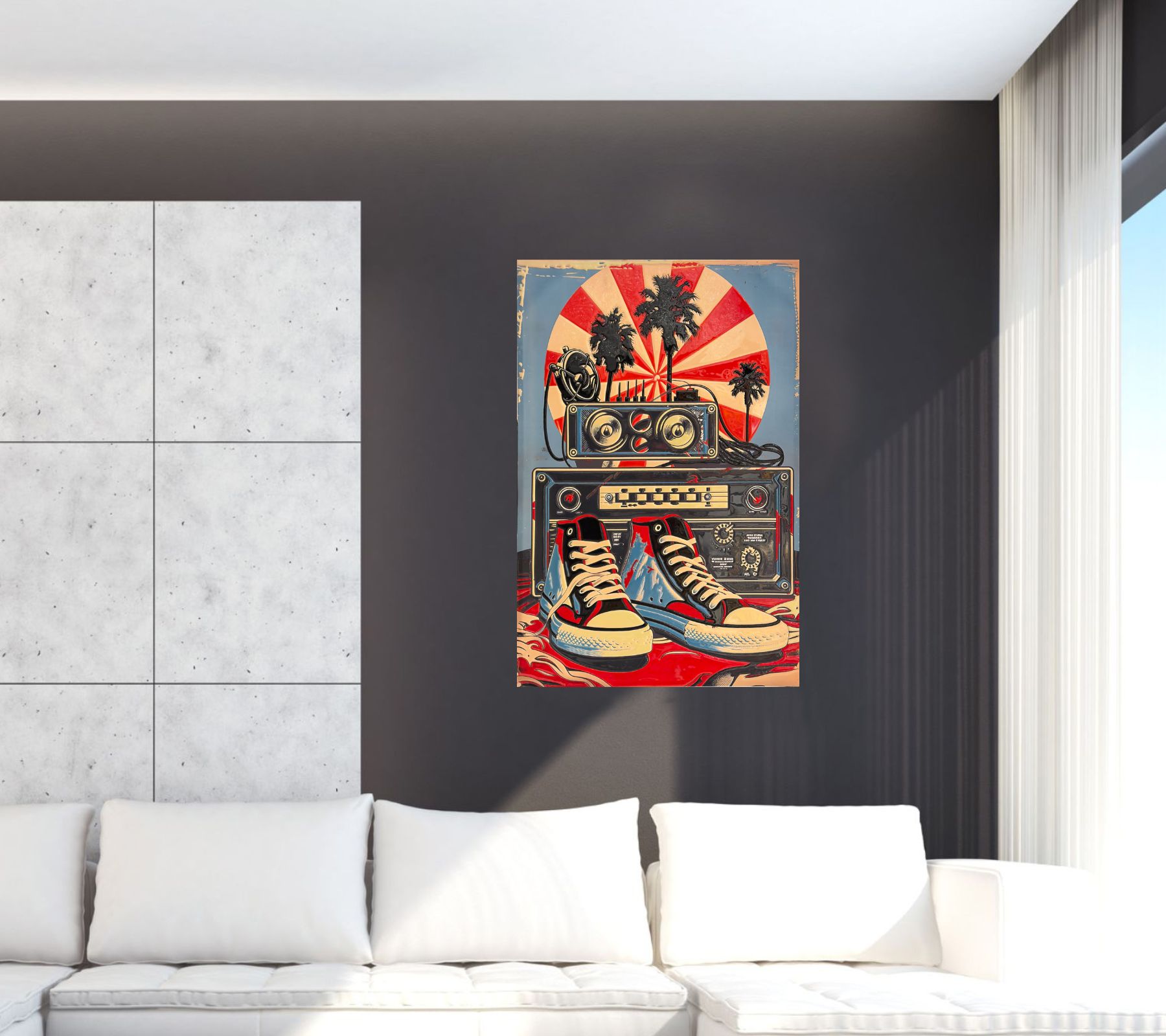 Street Beat captures the pulse of contemporary urban culture through bold imagery and rhythmic composition. The layered elements—vintage audio equipment, iconic sneakers, and radiant graphic forms—create a visual soundtrack of movement, nostalgia, and youthful expression. Resin textures and high-contrast colors amplify the sense of sound translated into form, where music becomes a shared language of identity and freedom.