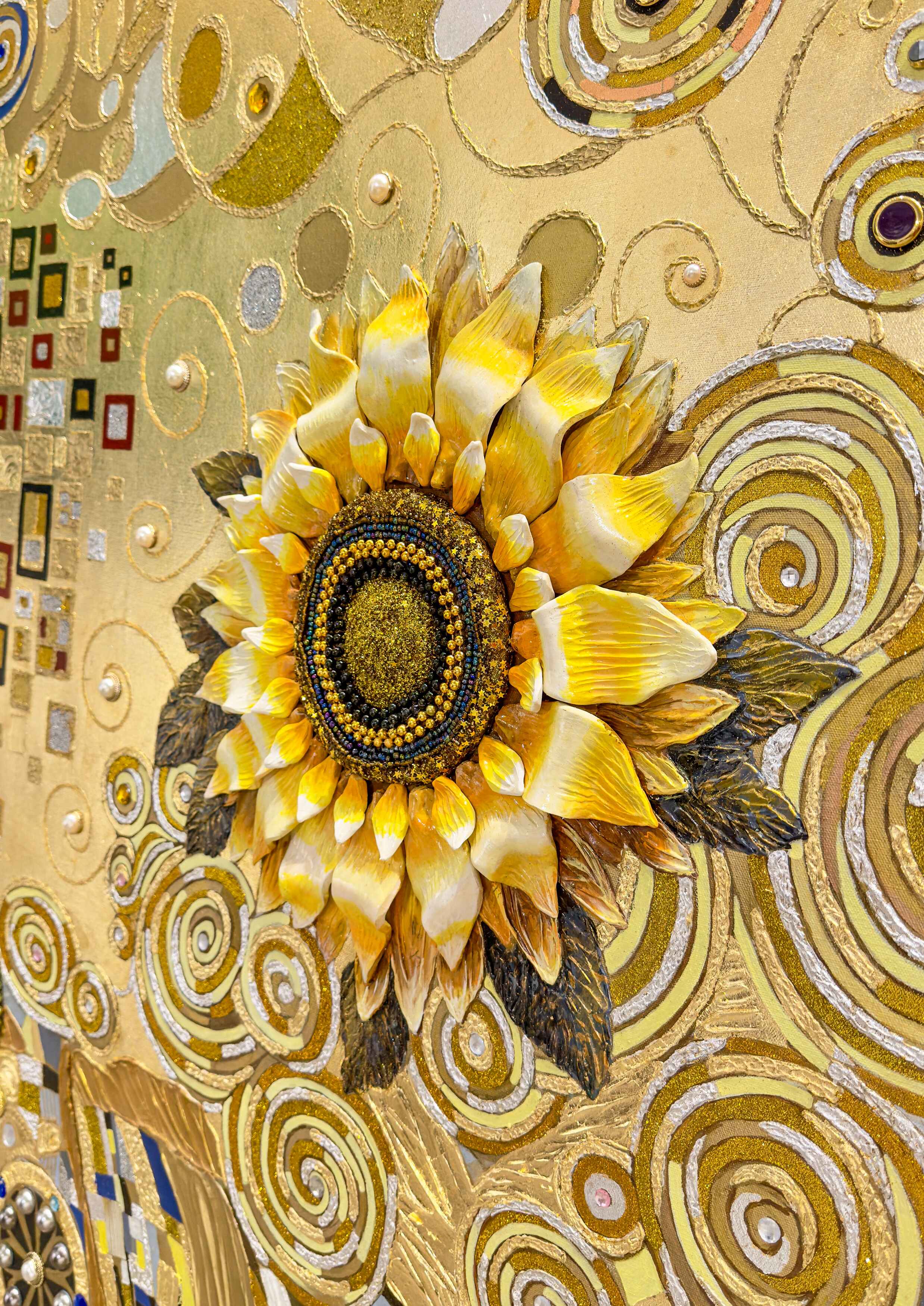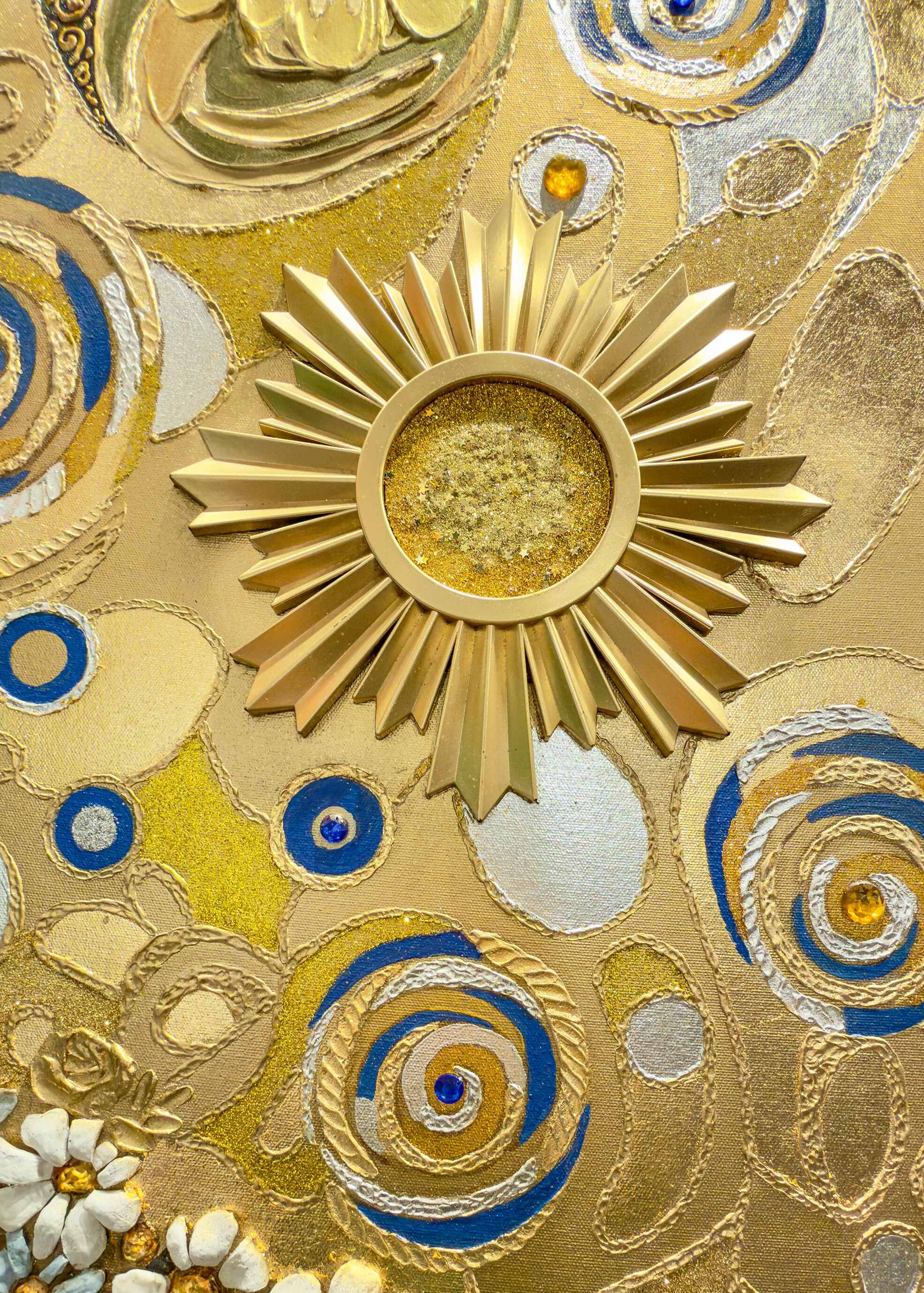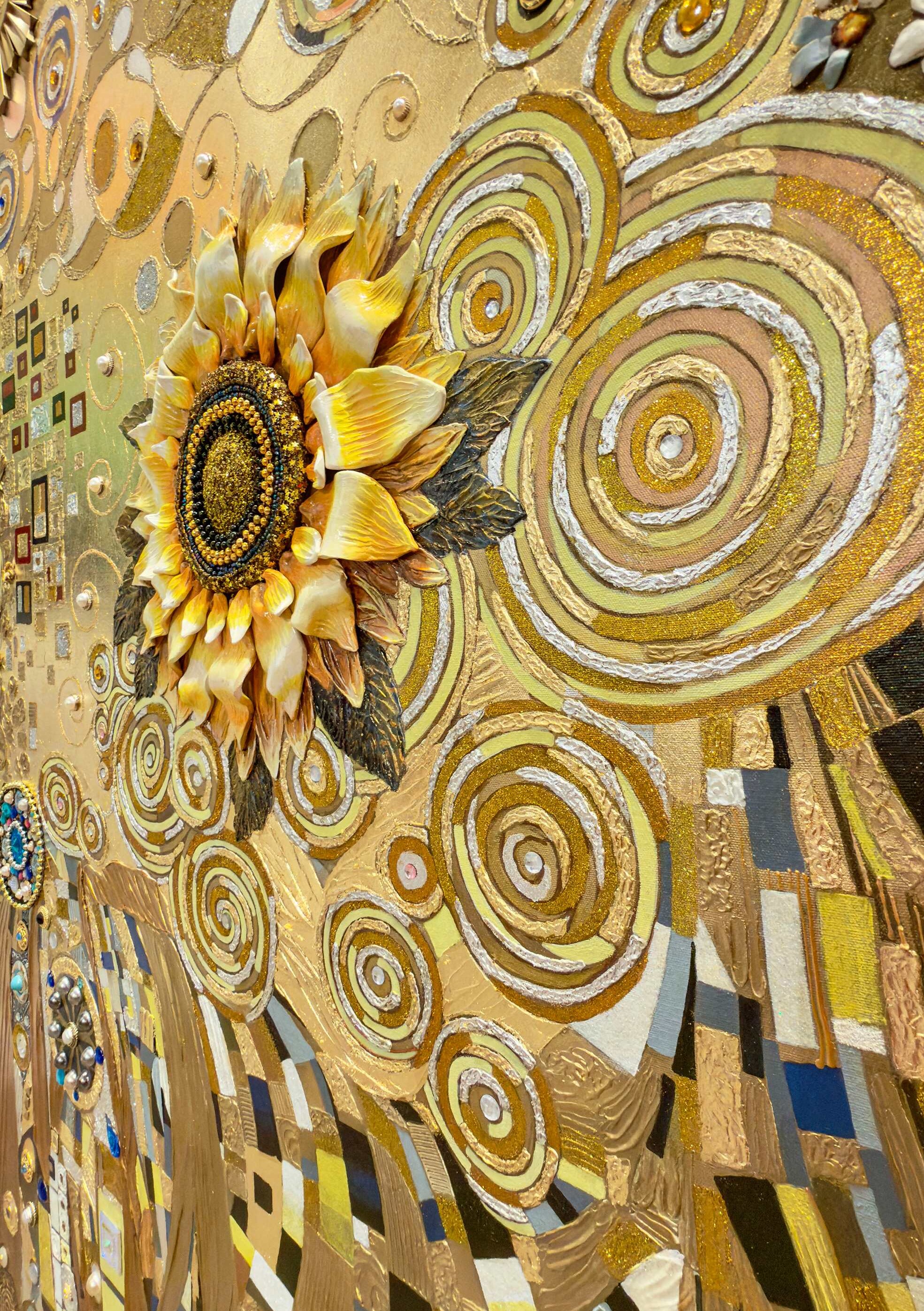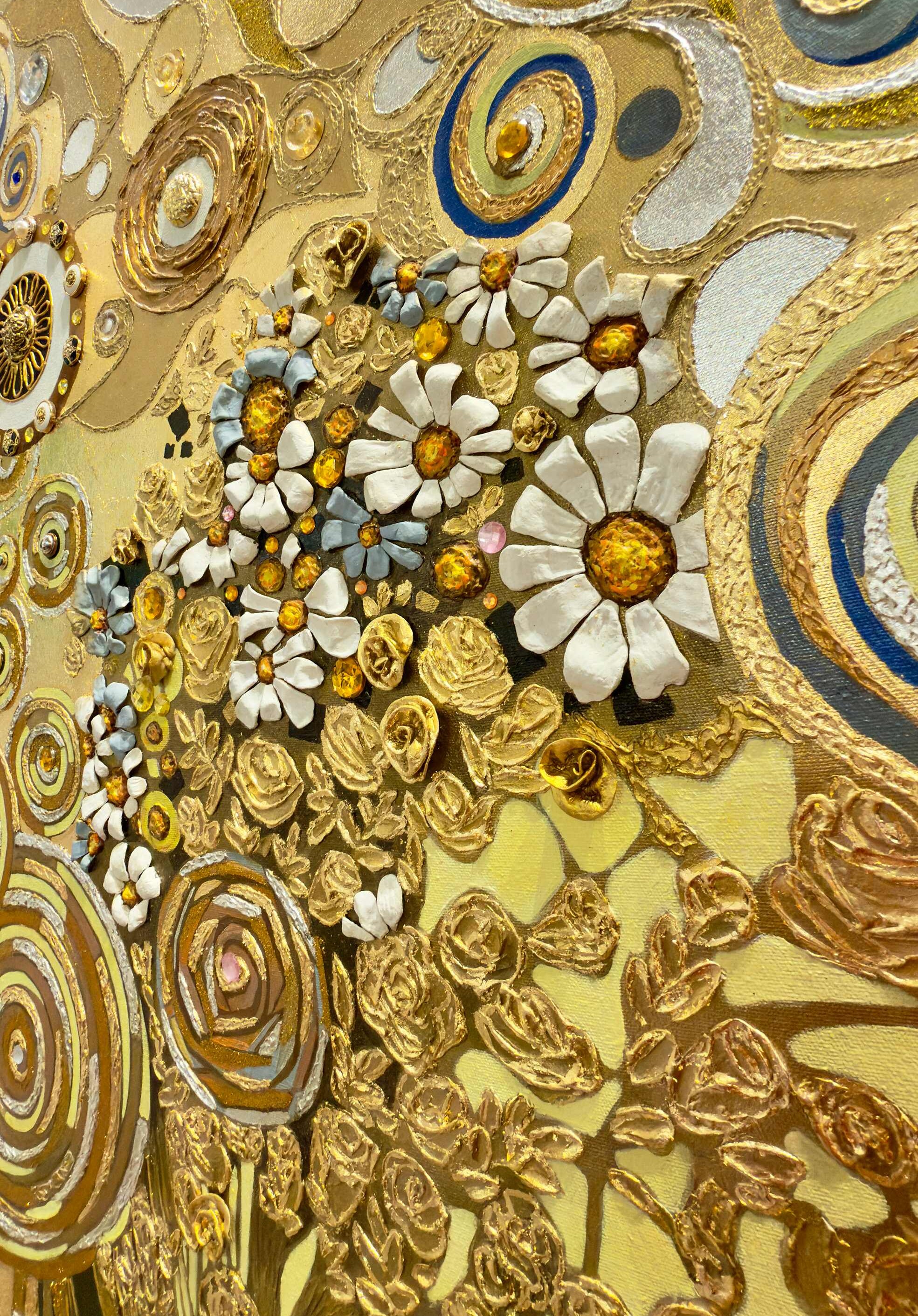 Sunny Joy of Life is a commissioned mixed-media artwork, created specifically for a private collector. Radiating warmth, abundance, and spiritual vitality, the composition unfolds through a richly layered golden palette. Swirling motifs, ornamental details, and tactile textures evoke themes of renewal and celebration. The central floral form becomes a symbol of life’s enduring energy, reflecting both the collector’s vision and the artist’s signature decorative abstraction.