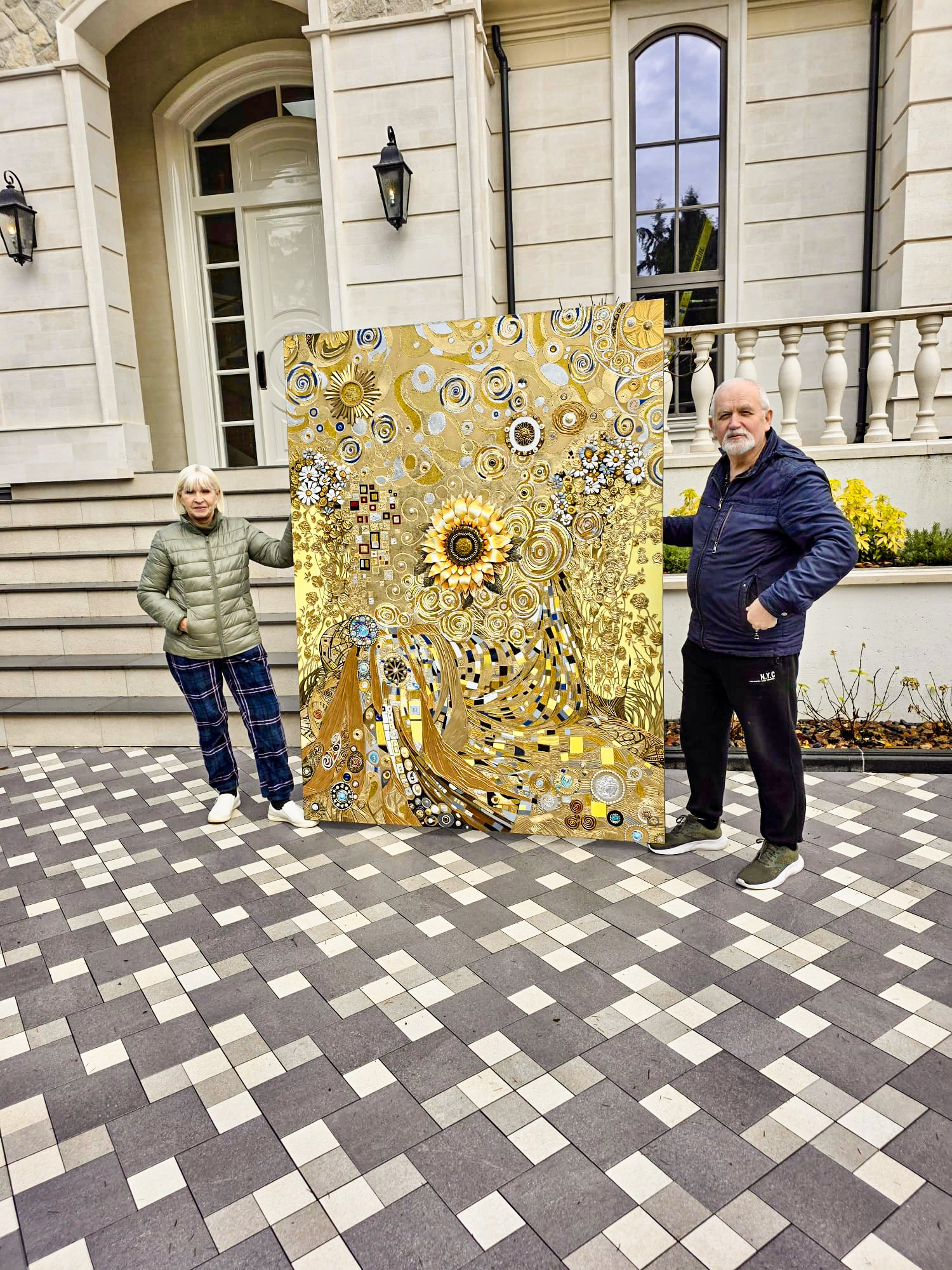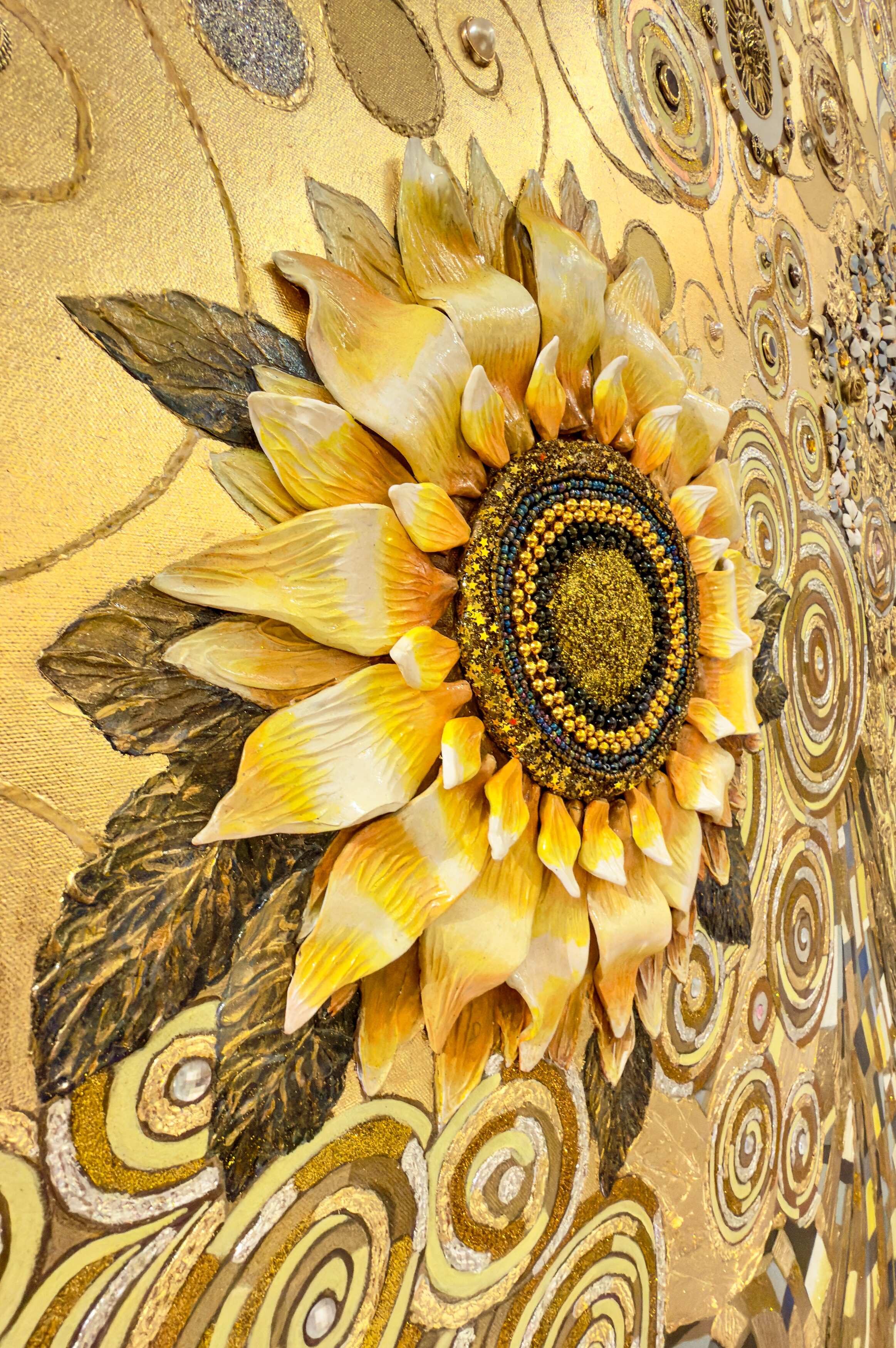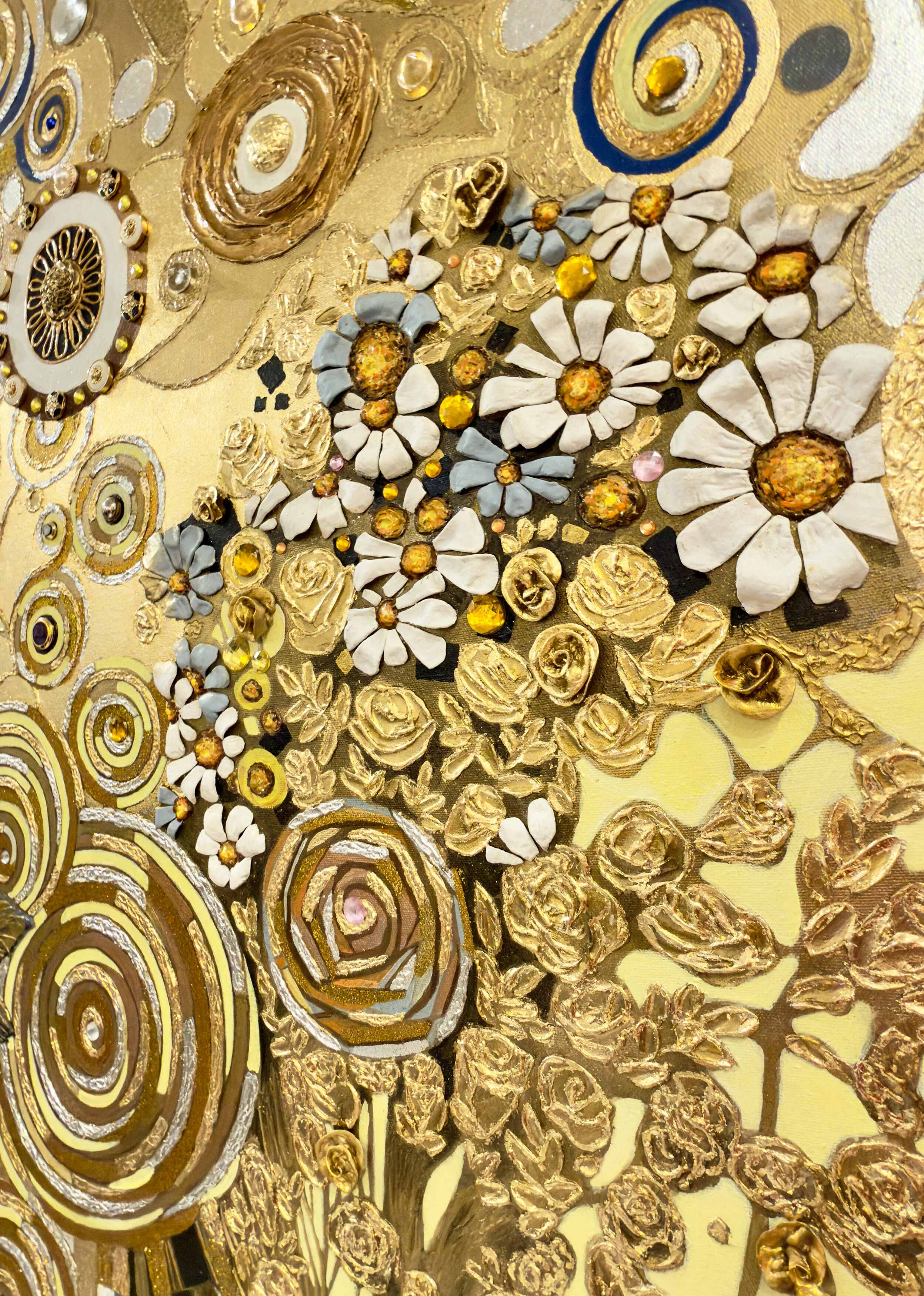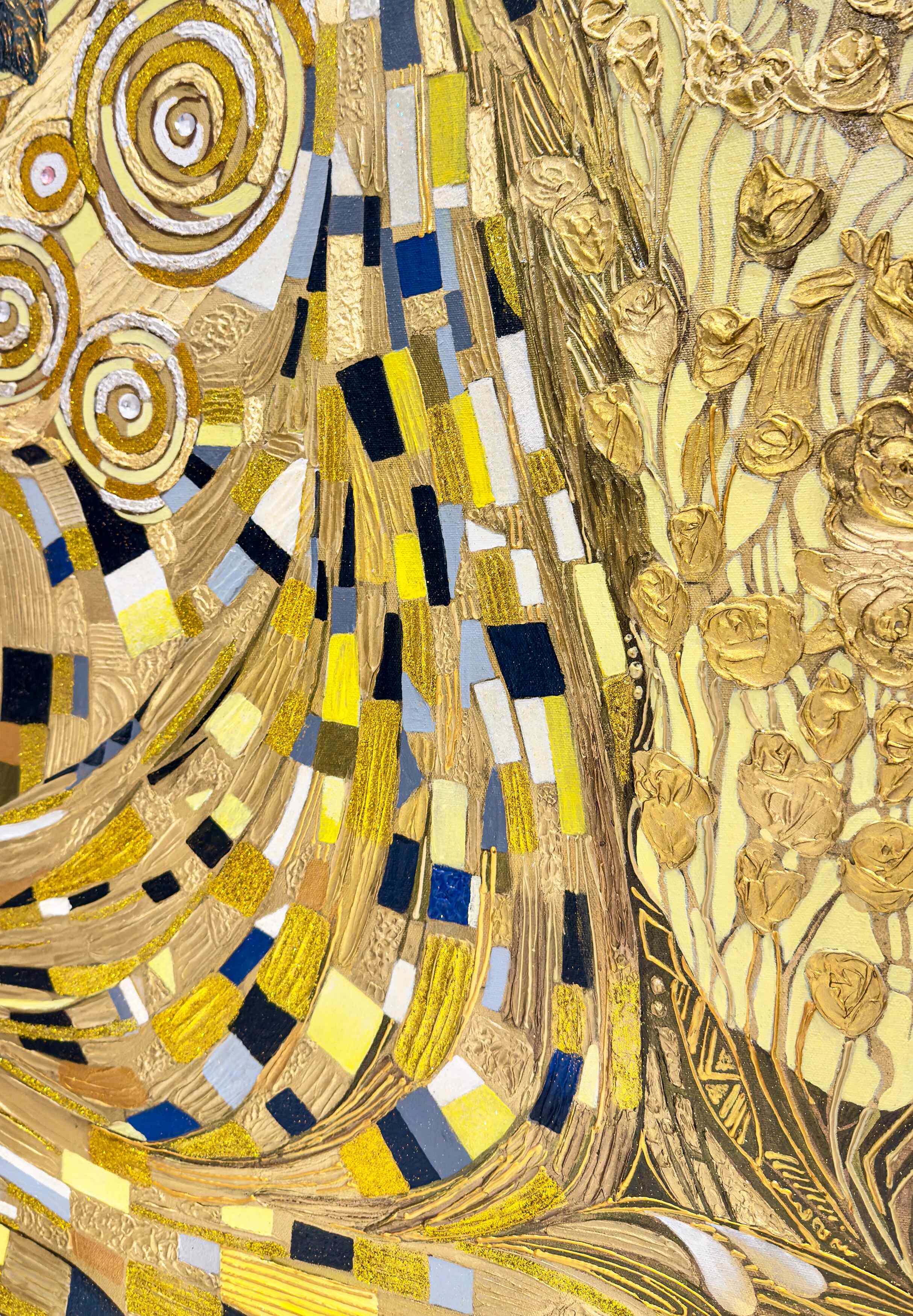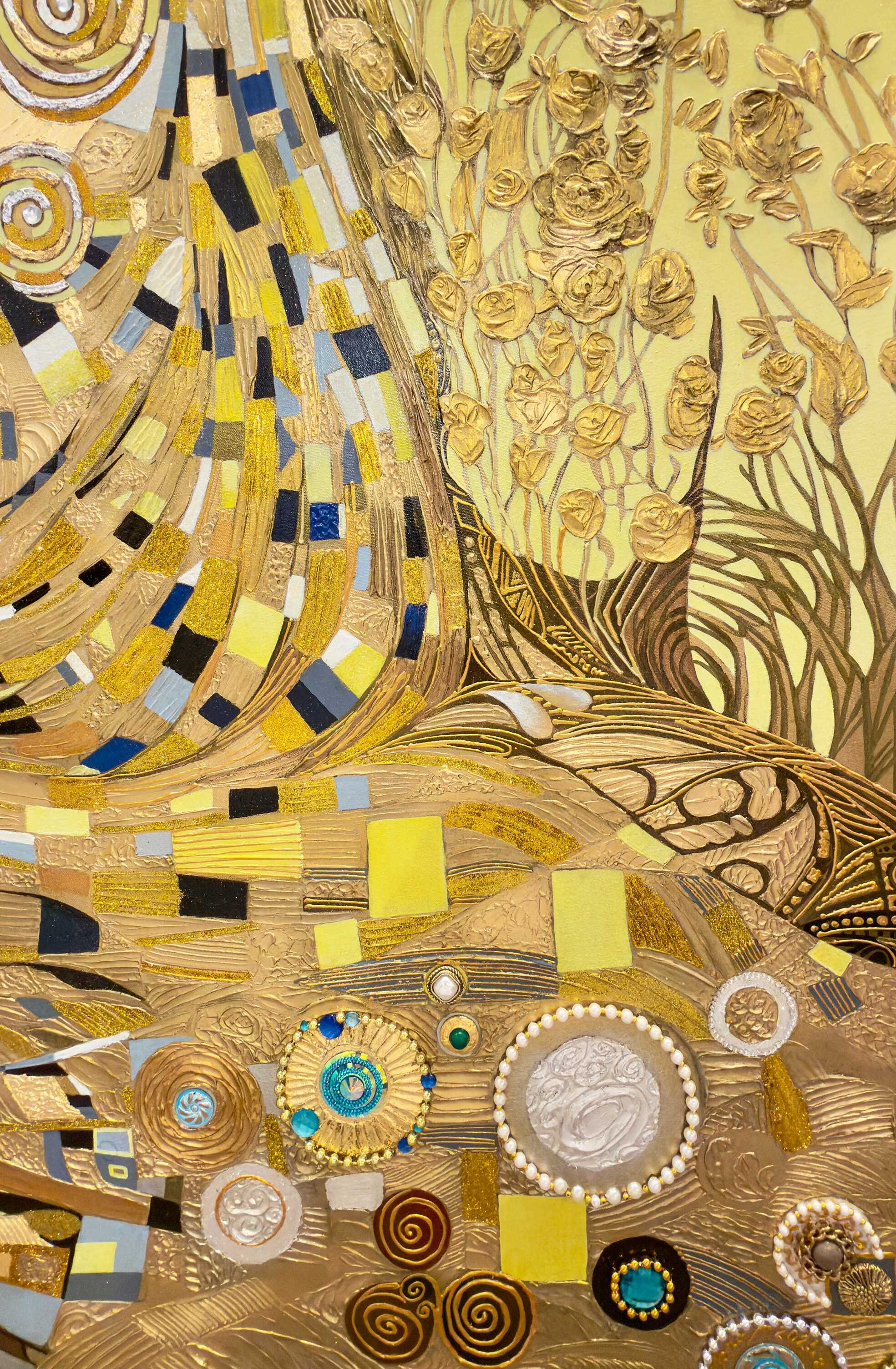 Sunny Joy of Life is a commissioned mixed-media artwork, created specifically for a private collector. Radiating warmth, abundance, and spiritual vitality, the composition unfolds through a richly layered golden palette. Swirling motifs, ornamental details, and tactile textures evoke themes of renewal and celebration. The central floral form becomes a symbol of life’s enduring energy, reflecting both the collector’s vision and the artist’s signature decorative abstraction.
