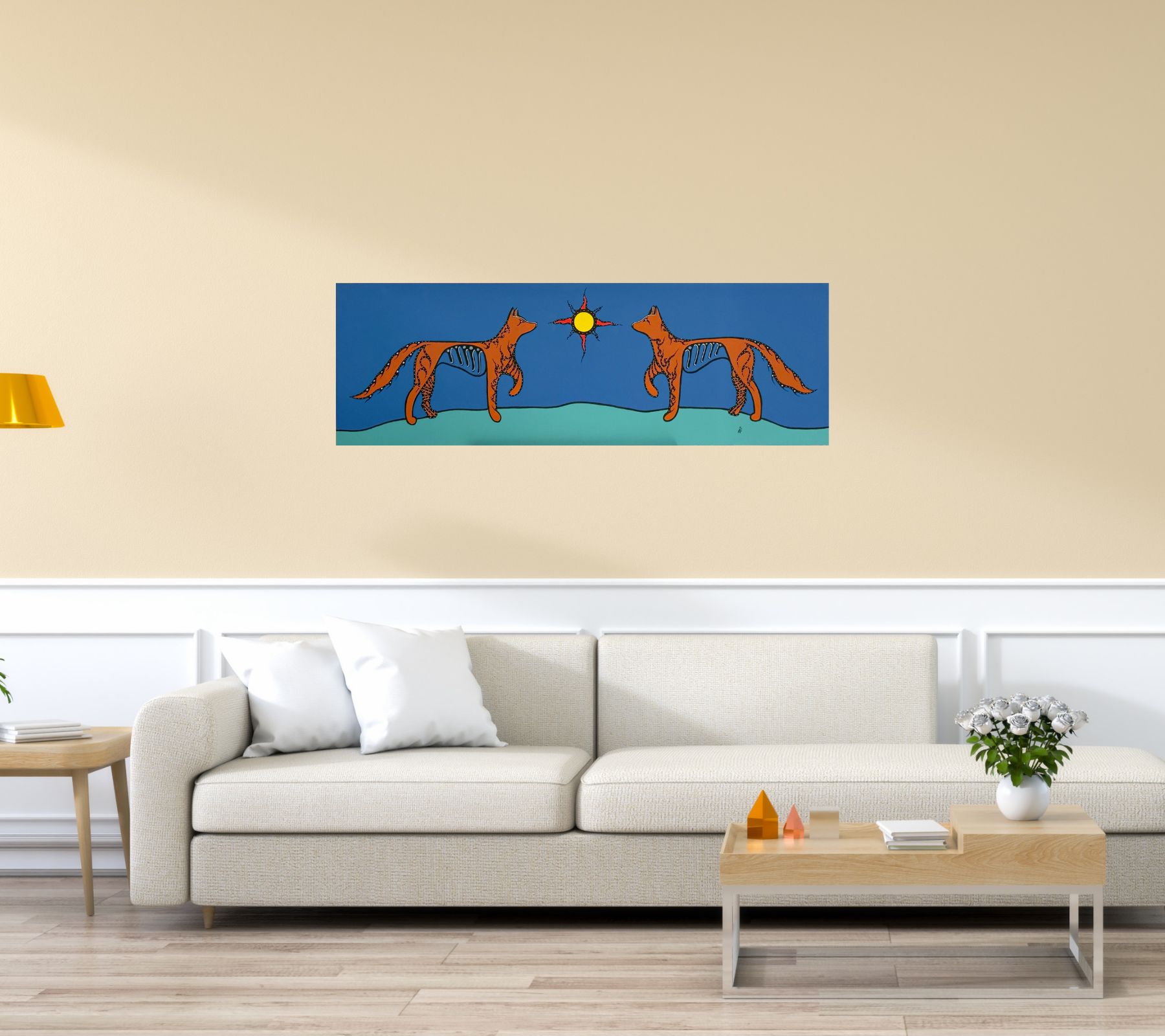 Twin Kits presents a strikingly balanced composition of two mirrored foxes standing beneath a radiant sun. Their poised stance and attentive gaze evoke instinct, awareness, and quiet communication, suggesting a deeper connection between beings and the natural world.