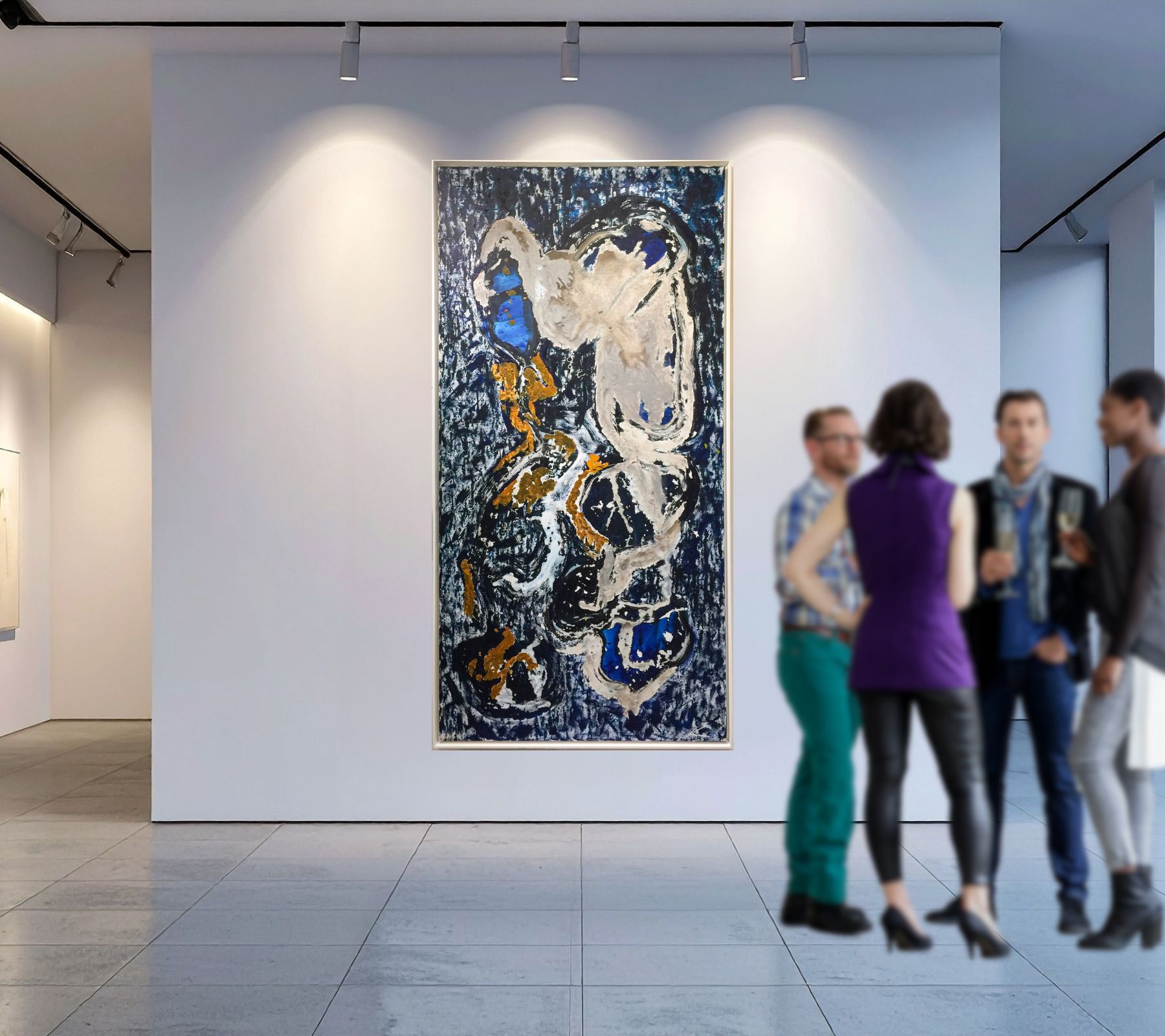 Blue Heron is a large-scale mixed media work inspired by the quiet intensity of a heron capturing its prey. Expansive in scale, the composition allows movement and gesture to unfold across the surface, immersing the viewer in the moment a blue heron feeds on a crab—not as a literal scene, but as an energetic exchange between instinct, patience, and survival. Deep blues, blacks, and mineral tones form a shifting environment where land, water, and motion merge.