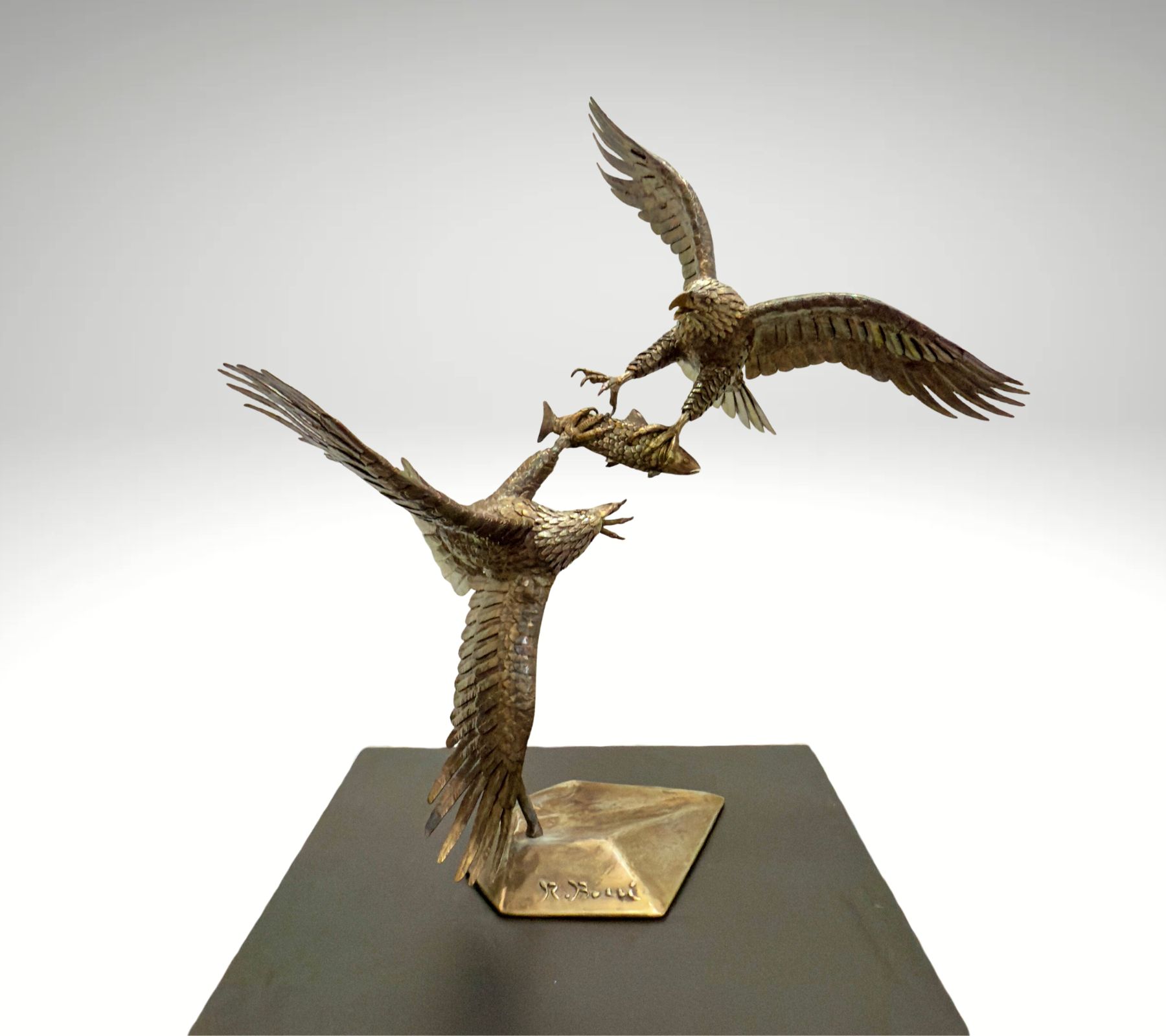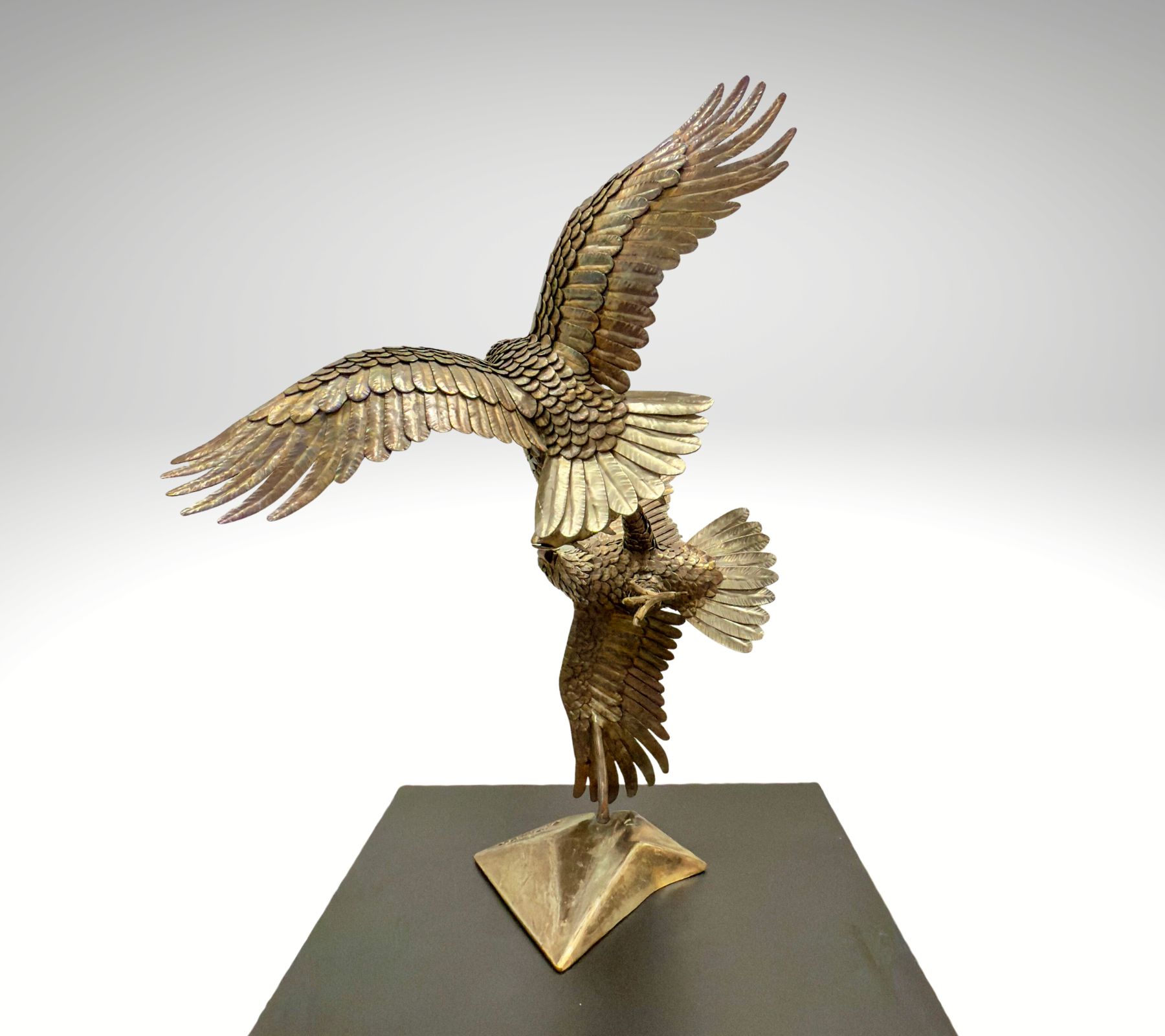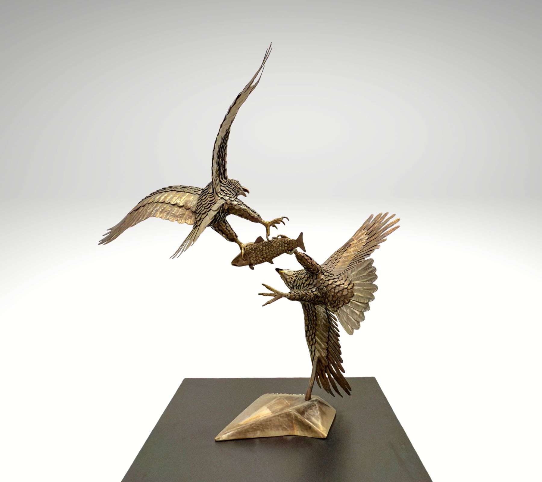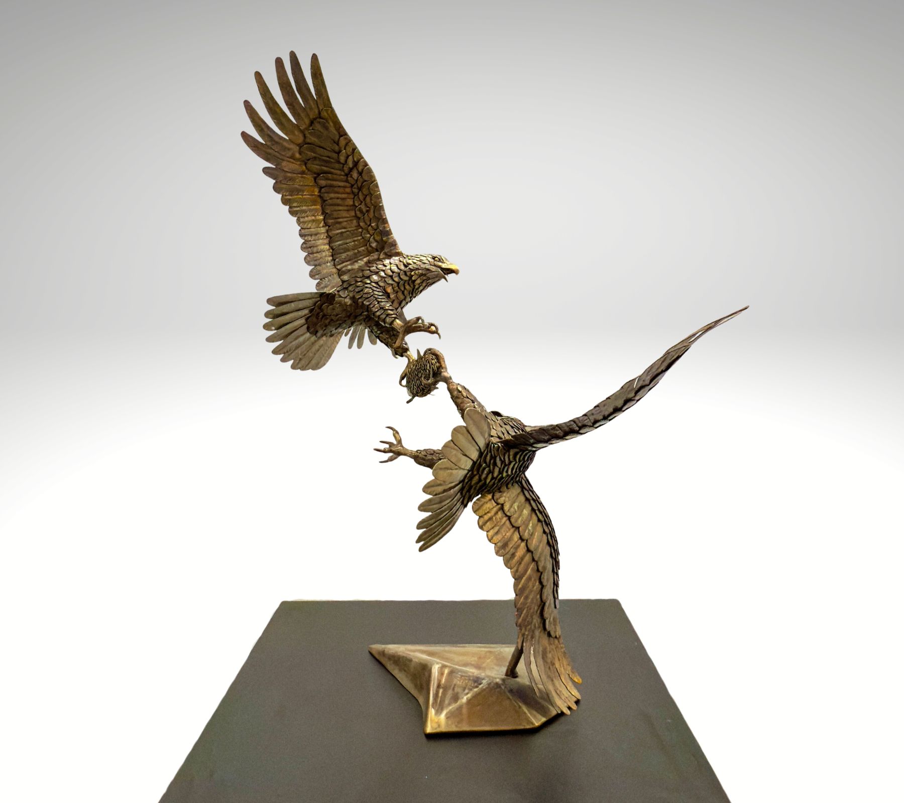 The sculptural composition emphasizes movement and precision—each feather articulated with care, each gesture frozen at the peak of action. Elevated on a minimal base, the work conveys both physical dynamism and symbolic resonance, evoking themes of instinct, dominance, and the raw poetry of nature.