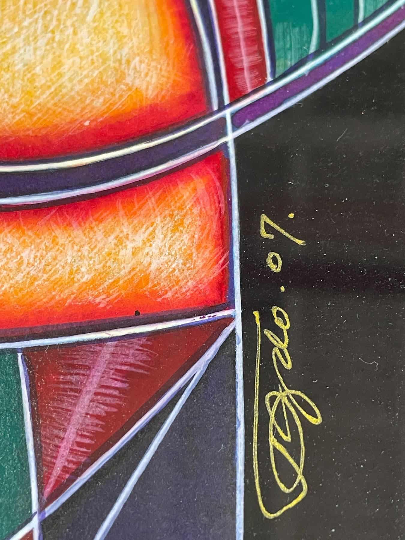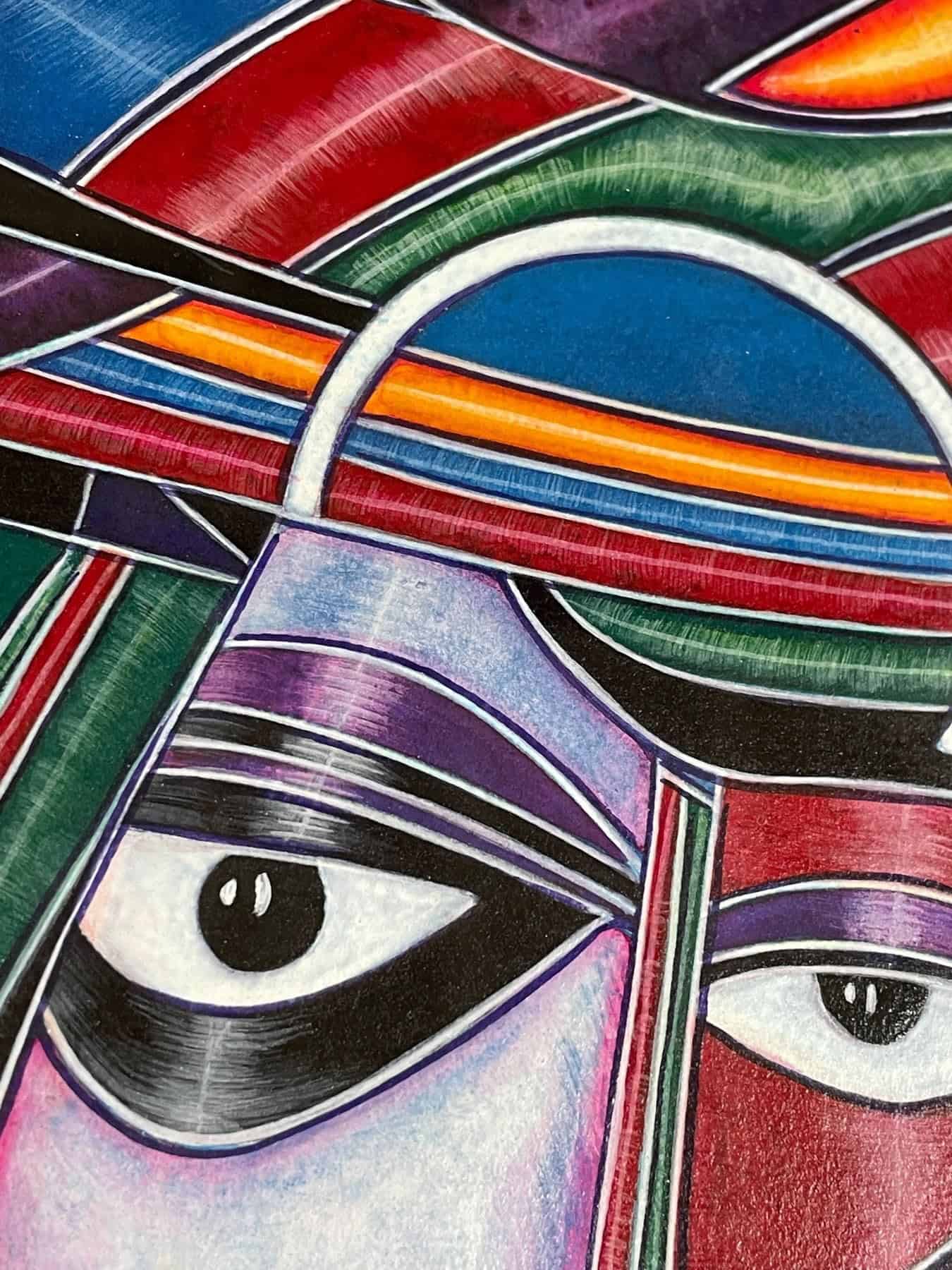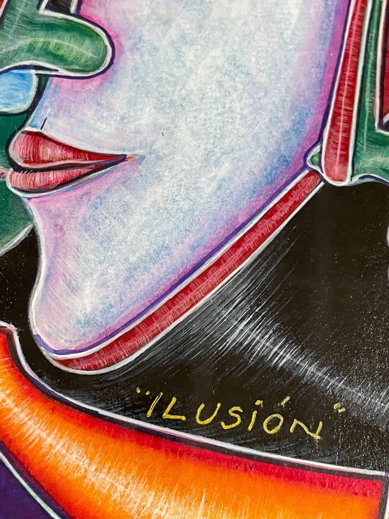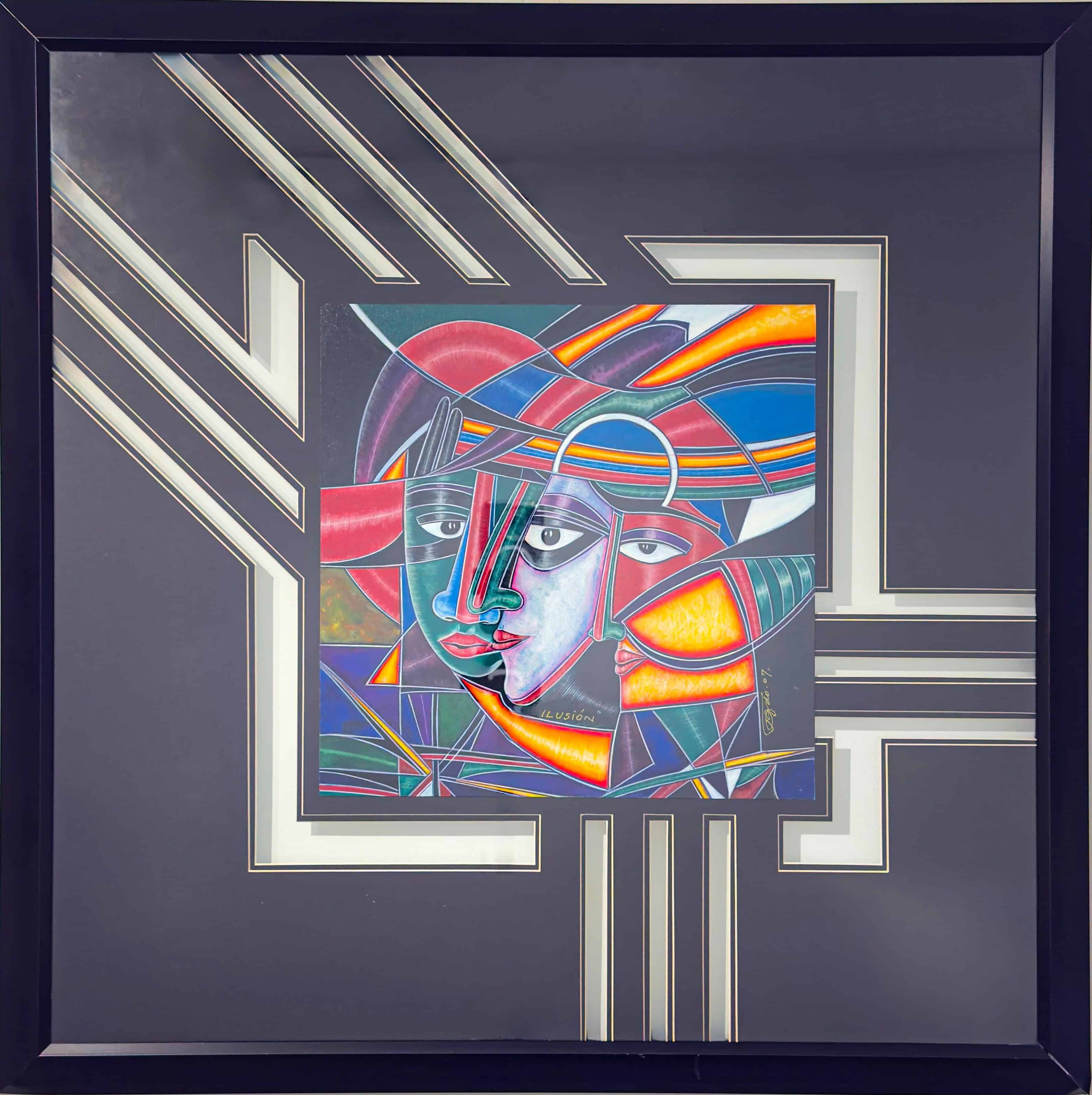"Ilusion" is a rare and striking original by Latin American artist Juan Quevedo, showcasing his signature fusion of Cubism, geometry, and radiant color. Painted in watercolor and mixed media on paper, the work unfolds like a multifaceted portrait—two faces intertwined, revealing shifting perspectives, emotion, and depth.
