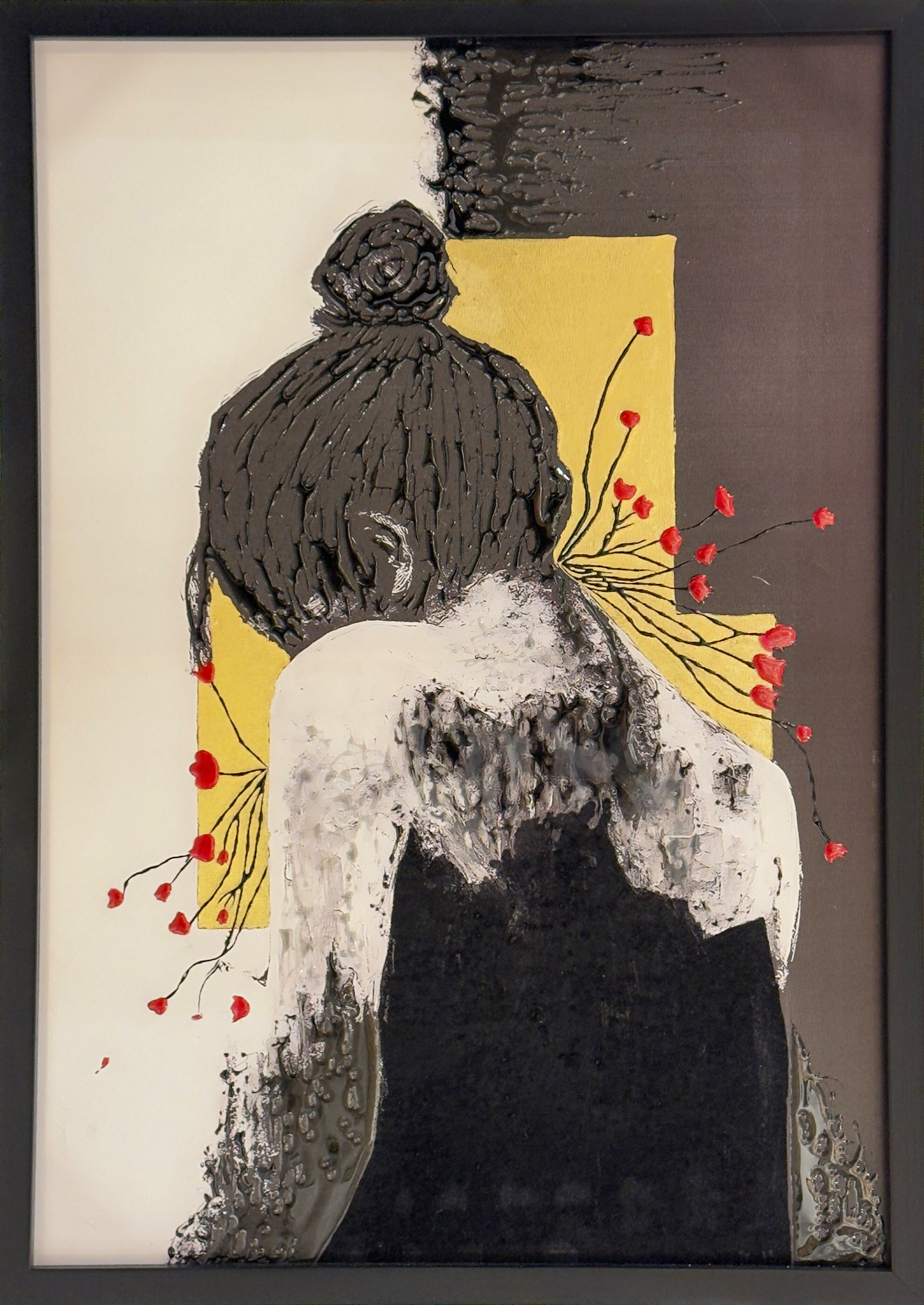 Stillness captures a moment of quiet retreat and inward reflection. The figure, turned away from the viewer, exists between light and shadow, framed by restrained geometry and delicate organic elements. Textural contrasts between resin, pigment, and surface create a sense of emotional depth, suggesting calm not as absence, but as presence—an intentional pause where strength is restored through silence.